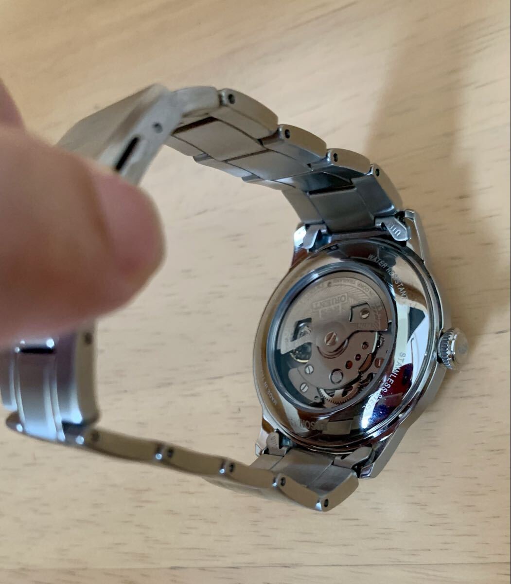 ・その他特徴: 秒針停止装置付、22石、シースルーバック、日付