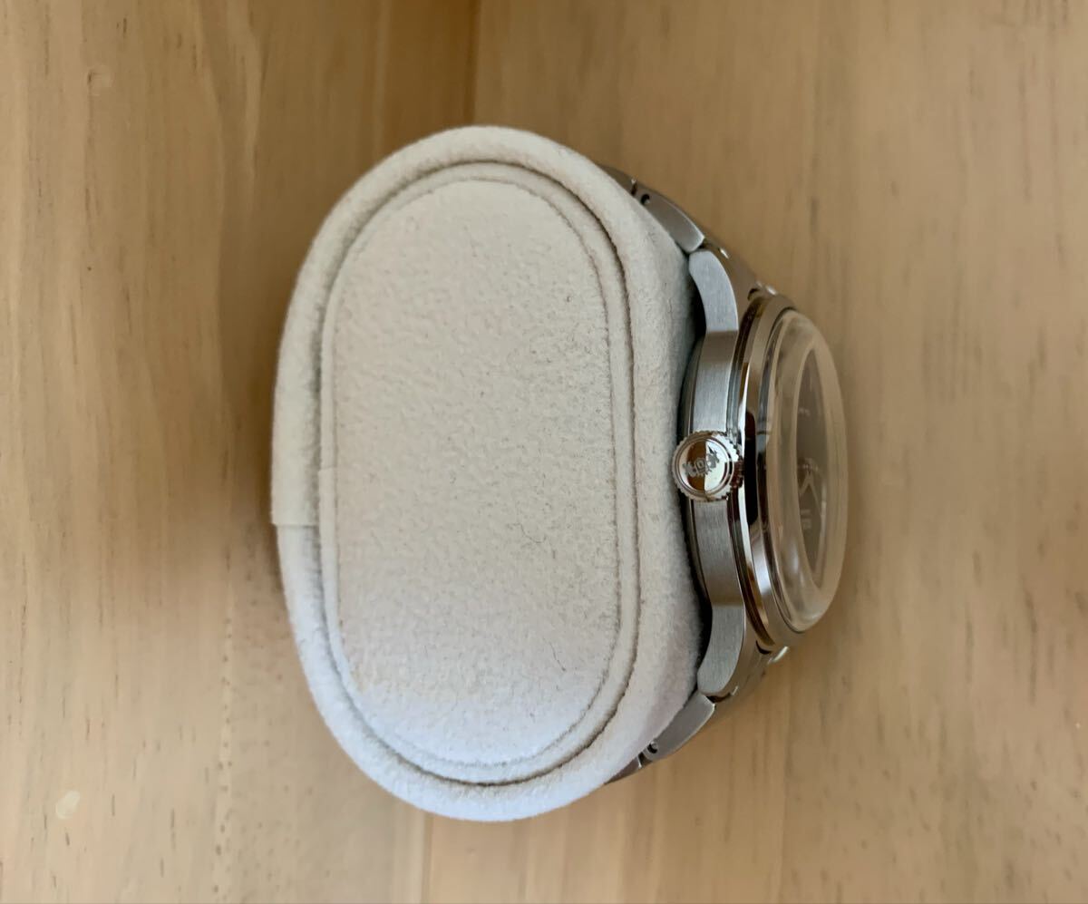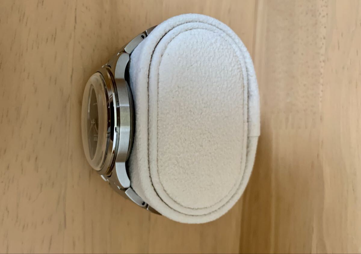 文字盤は流行りの淡いブルーですが、角度によっては薄いパープルにも見えるきれいなカラーです。