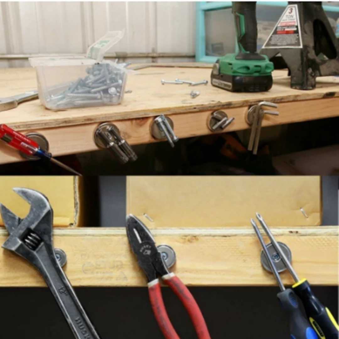 この強力磁石を壁に付けて、工具などをこの強力磁石にくっ付けることで工具の収納と片付けに最適です。