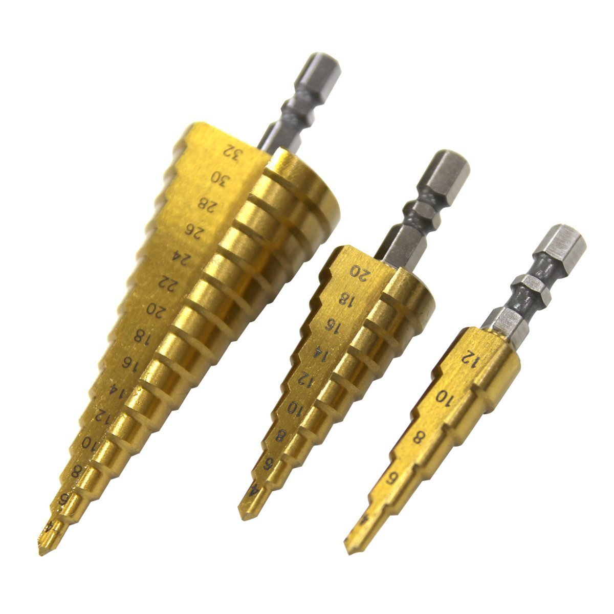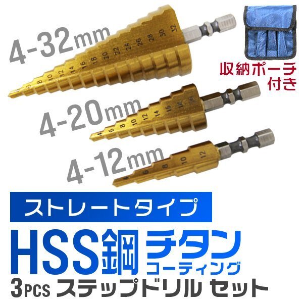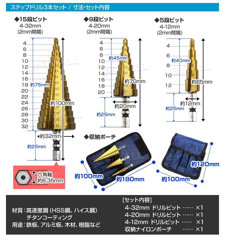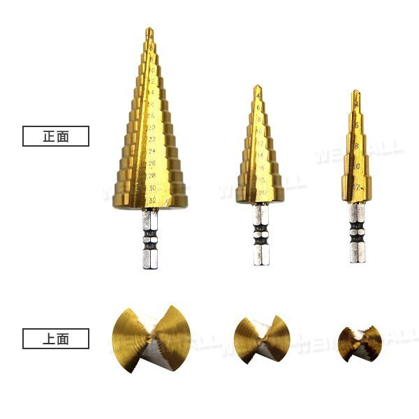 | HSS鋼タイプのステップドリル3本セット 薄い鉄板・アルミ板・木材・樹脂等の穴あけと穴の拡大に適した切削工具です。 穴あけ・下穴拡大・面取り・バリ取りなどの作業がこちらの3本セットで全て可能! 専用ナイロンポーチが付属します。 |