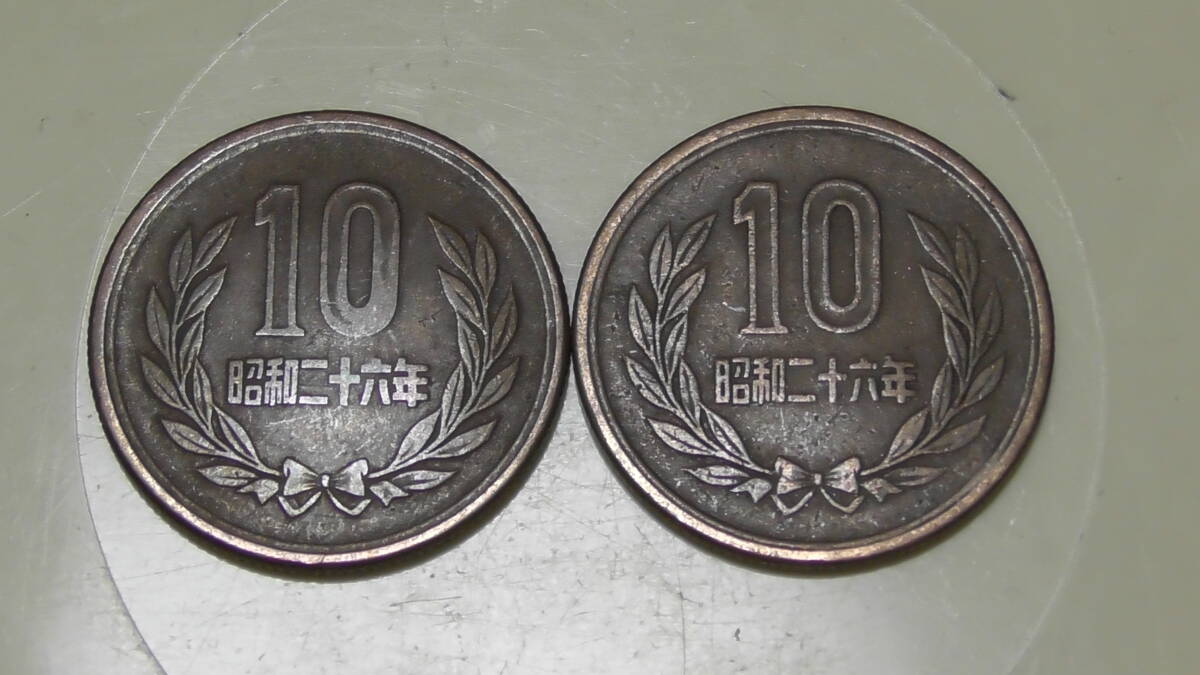 ●10円硬貨(ギザ10)/昭和26年の2枚です。