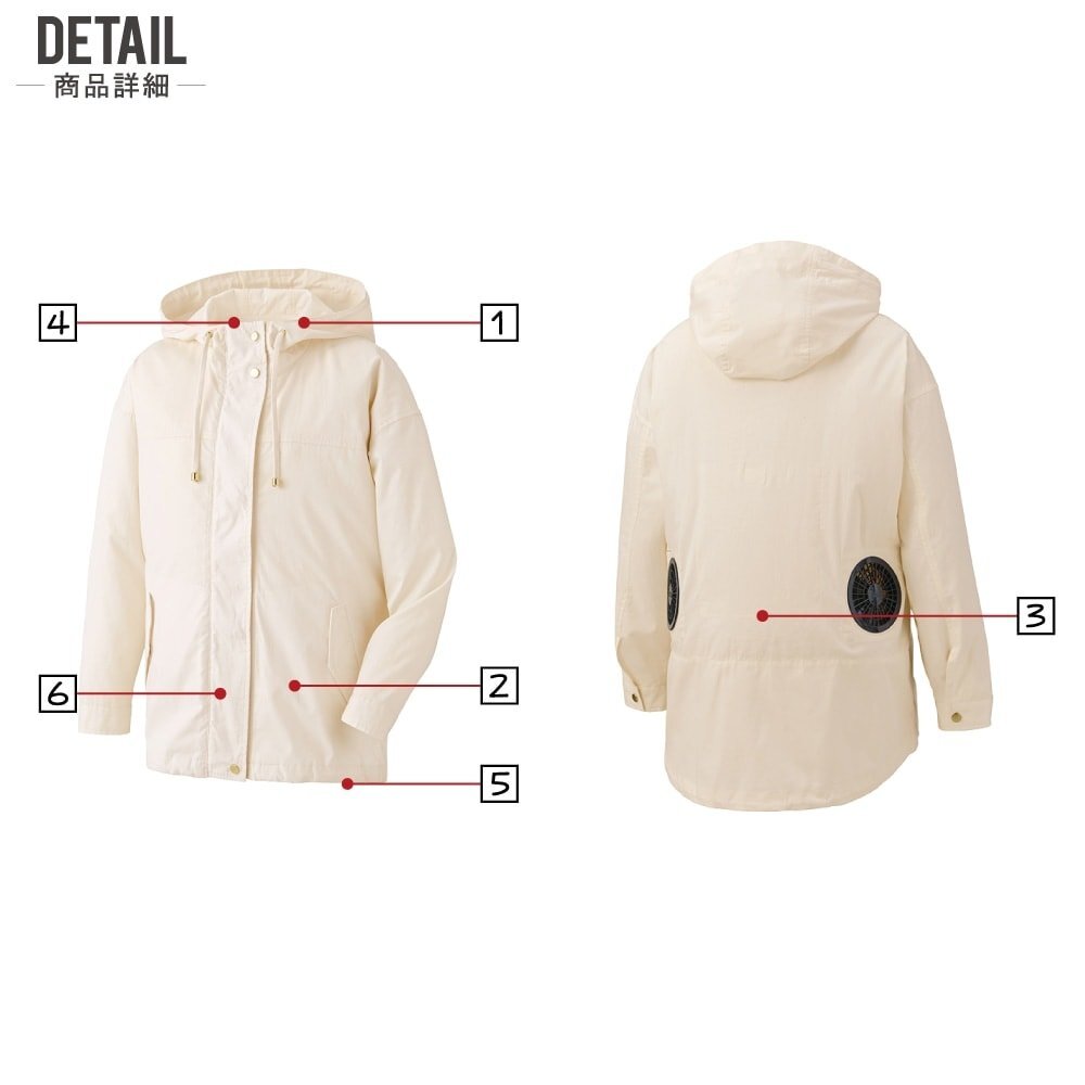 特長:UVカット/調整紐(首元)/左内側パッテリー専用ポケット/保冷剤用メッシュポケット/裾ドローコード/インナーガード(二重裾)