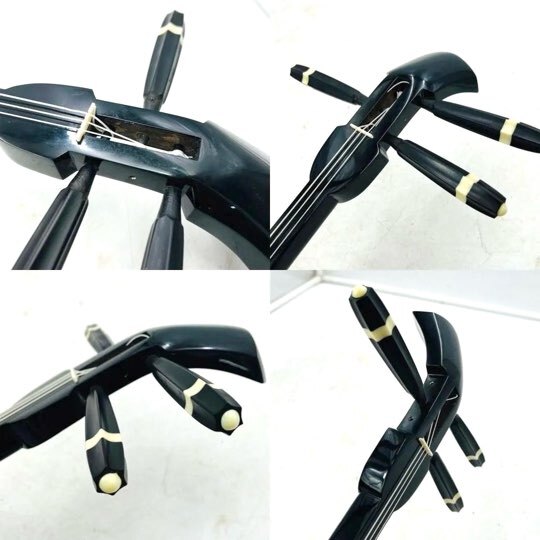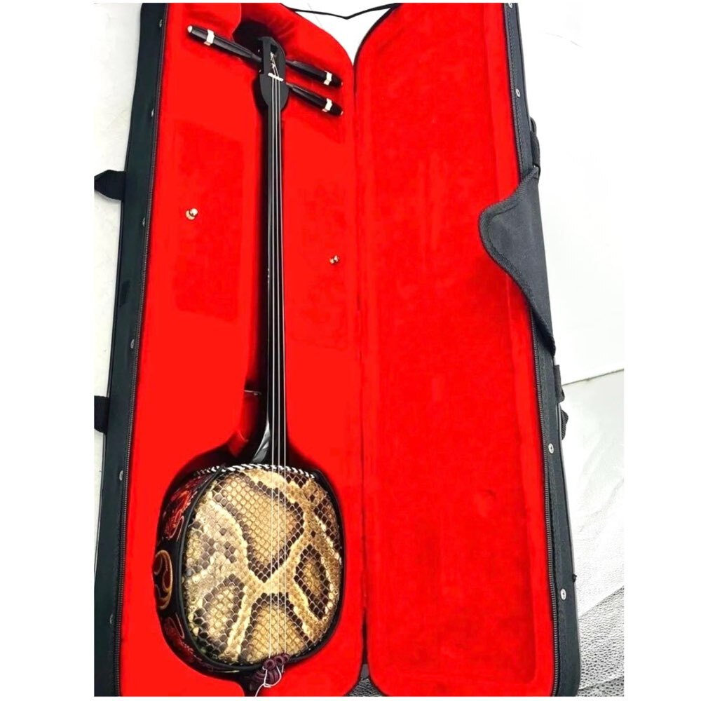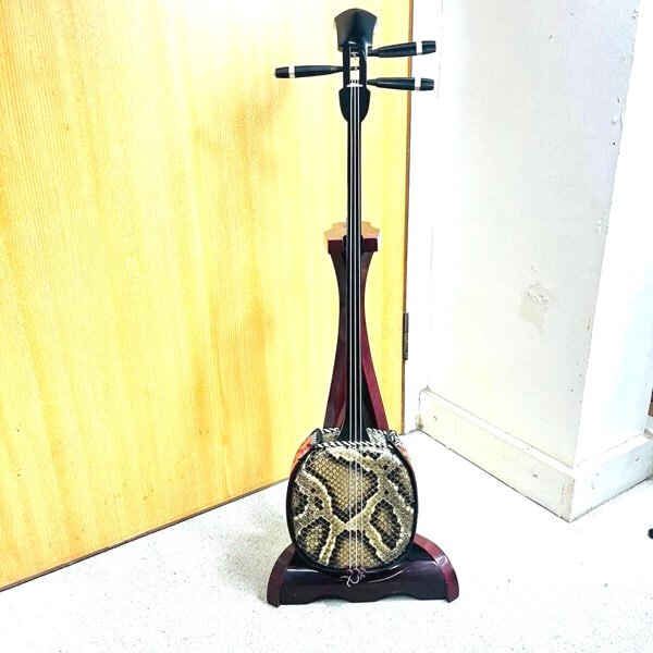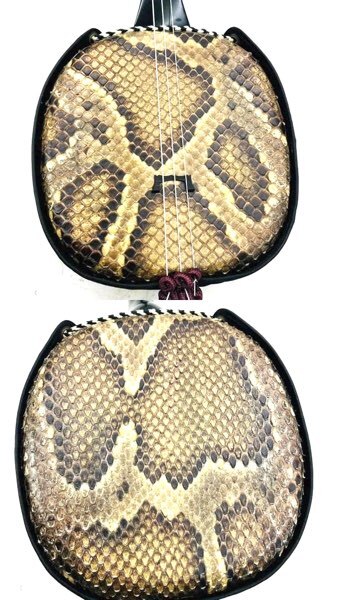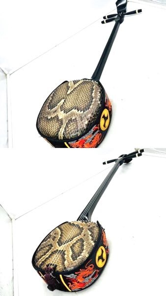 黒塗りの棹と美しい蛇皮、さらに豪華な刺繍入り胴巻が付属しており、舞台映え・演奏映えする仕様です。