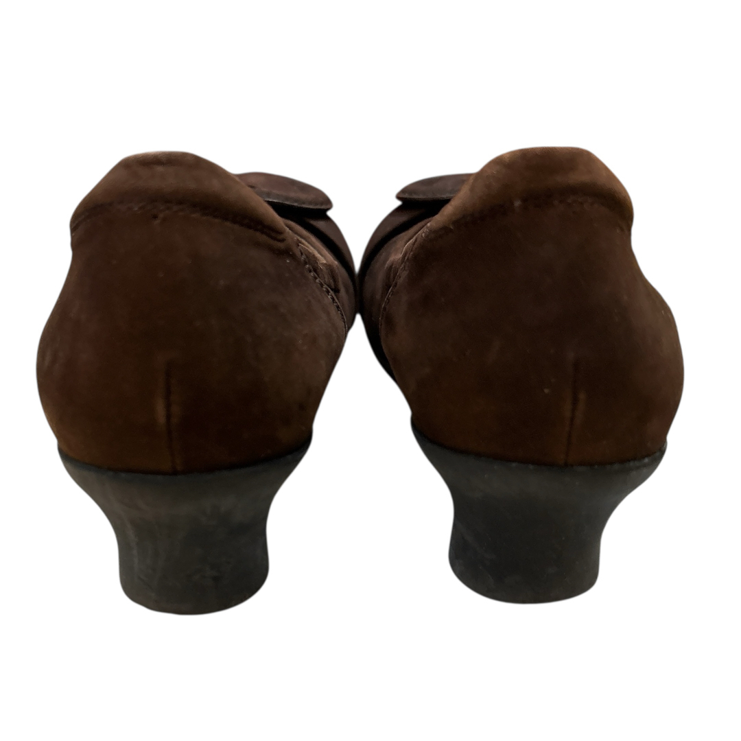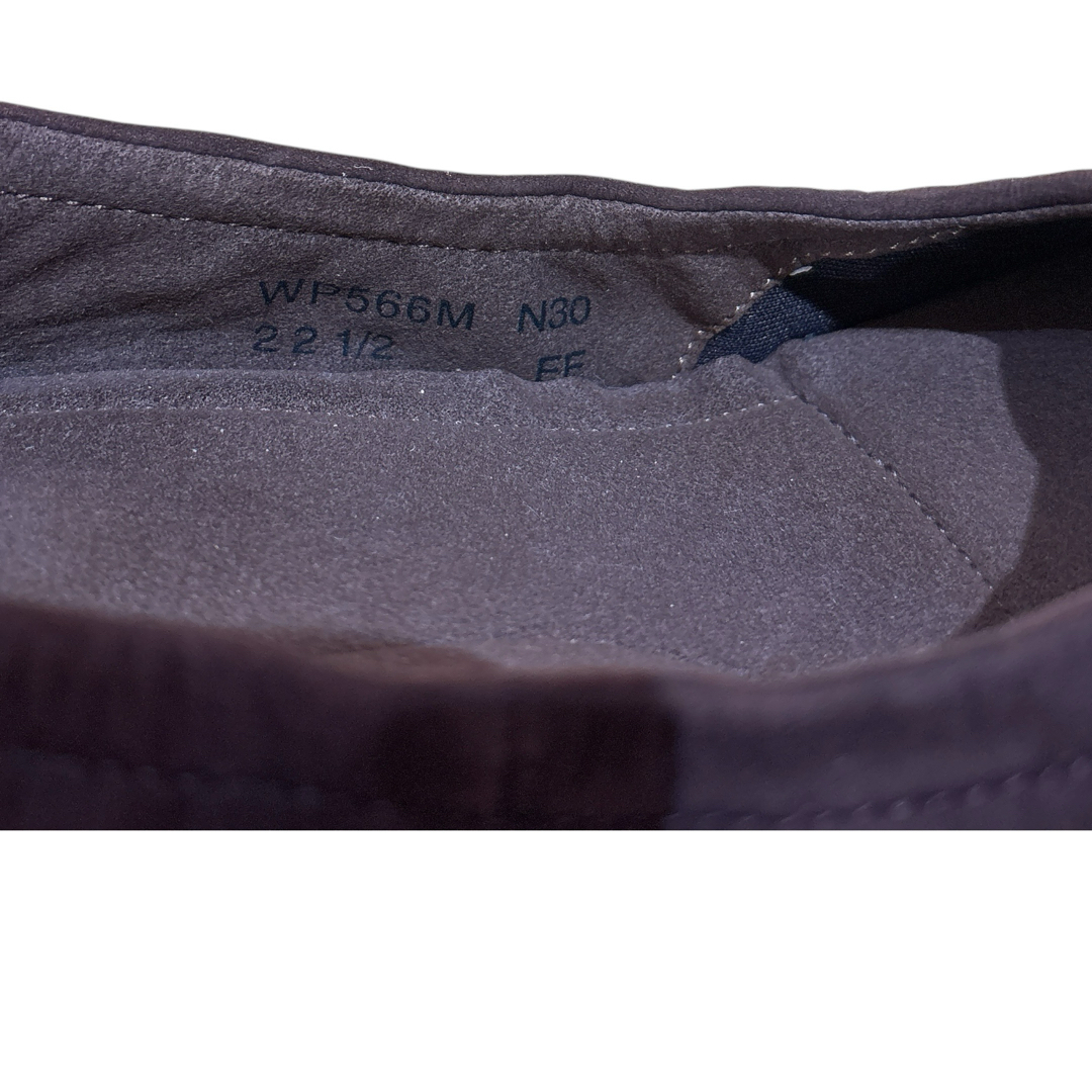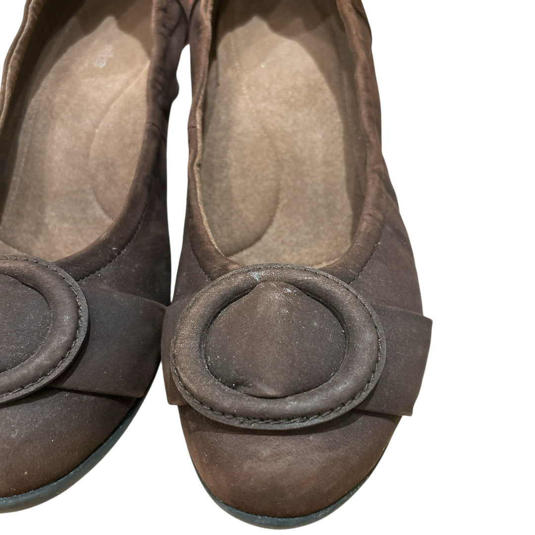 落ち着いたブラウンのスエード調素材と、フロントの個性的なバックルが上品なアクセントに。シンプルなデザインながらも、足元に程よい存在感を与えてくれます。デニムなどのカジュアルなスタイルから、きれいめなスカートやパンツスタイルまで、幅広いコーディネートに合わせやすい一足です。