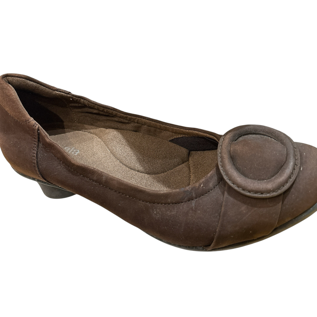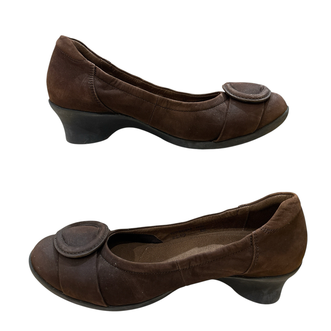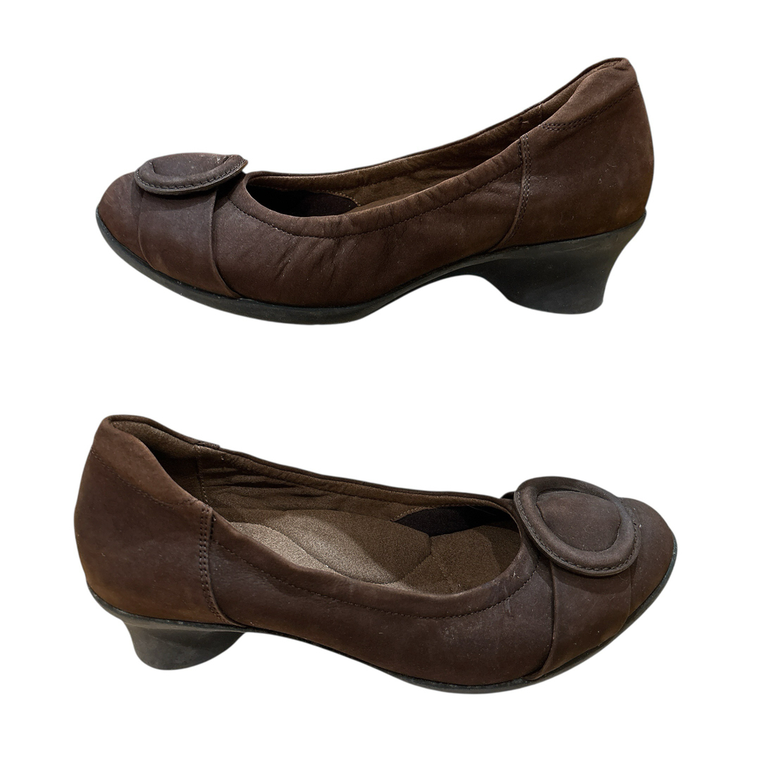 落ち着いたブラウンのスエード調素材と、フロントの個性的なバックルが上品なアクセントに。シンプルなデザインながらも、足元に程よい存在感を与えてくれます。デニムなどのカジュアルなスタイルから、きれいめなスカートやパンツスタイルまで、幅広いコーディネートに合わせやすい一足です。