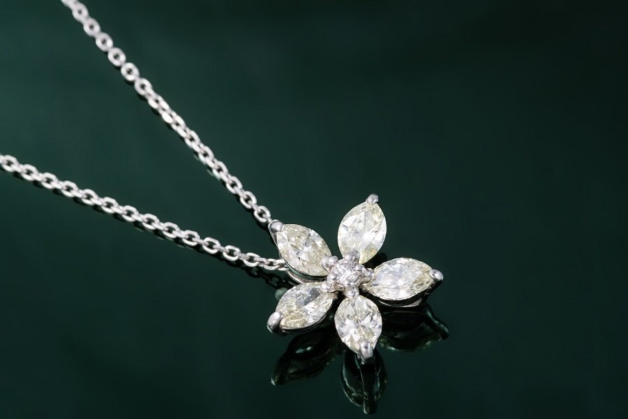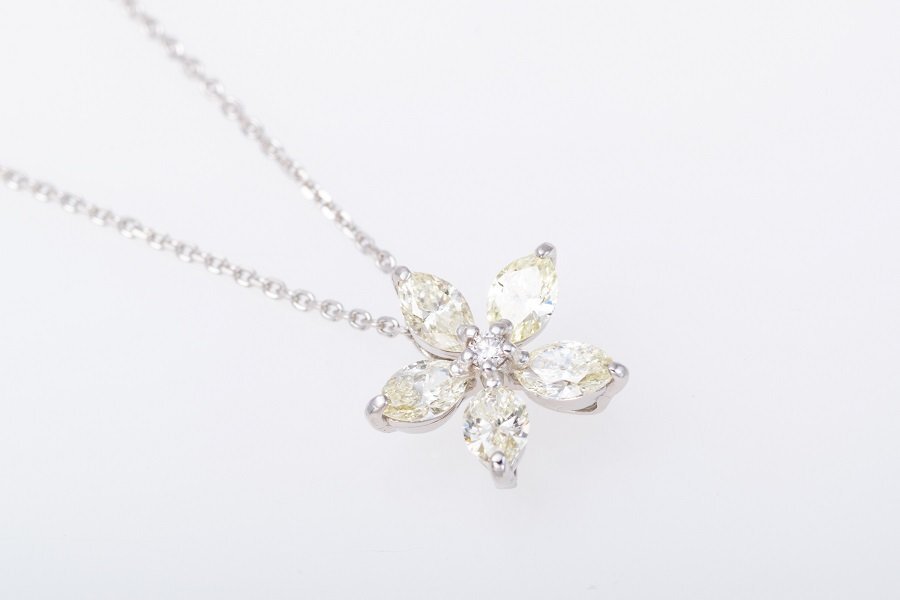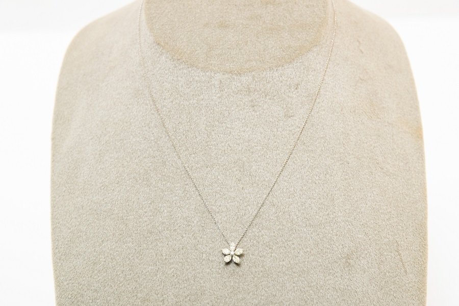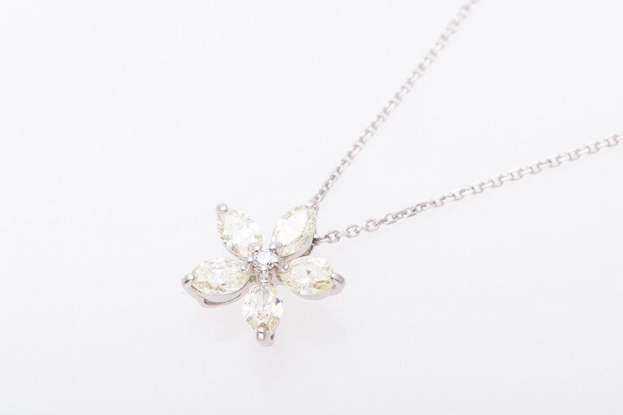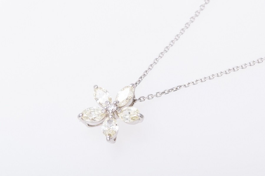 説明花のデザインのプラチナ(900)の枠に、合計0.58ctのダイヤモンドがセットされたネックレスです。