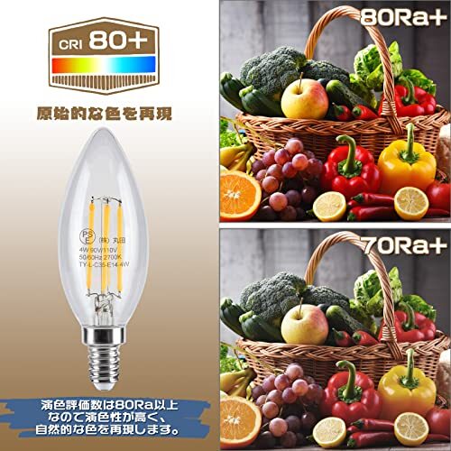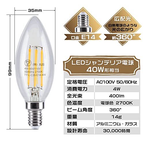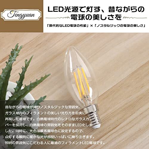 | 商品名 | Tengyuan LEDシャンデリア電球 口金E14 40W形相当 電球色2700K 4W LEDエジソン電球 フィラメント 全方向配光 クリア | ||||