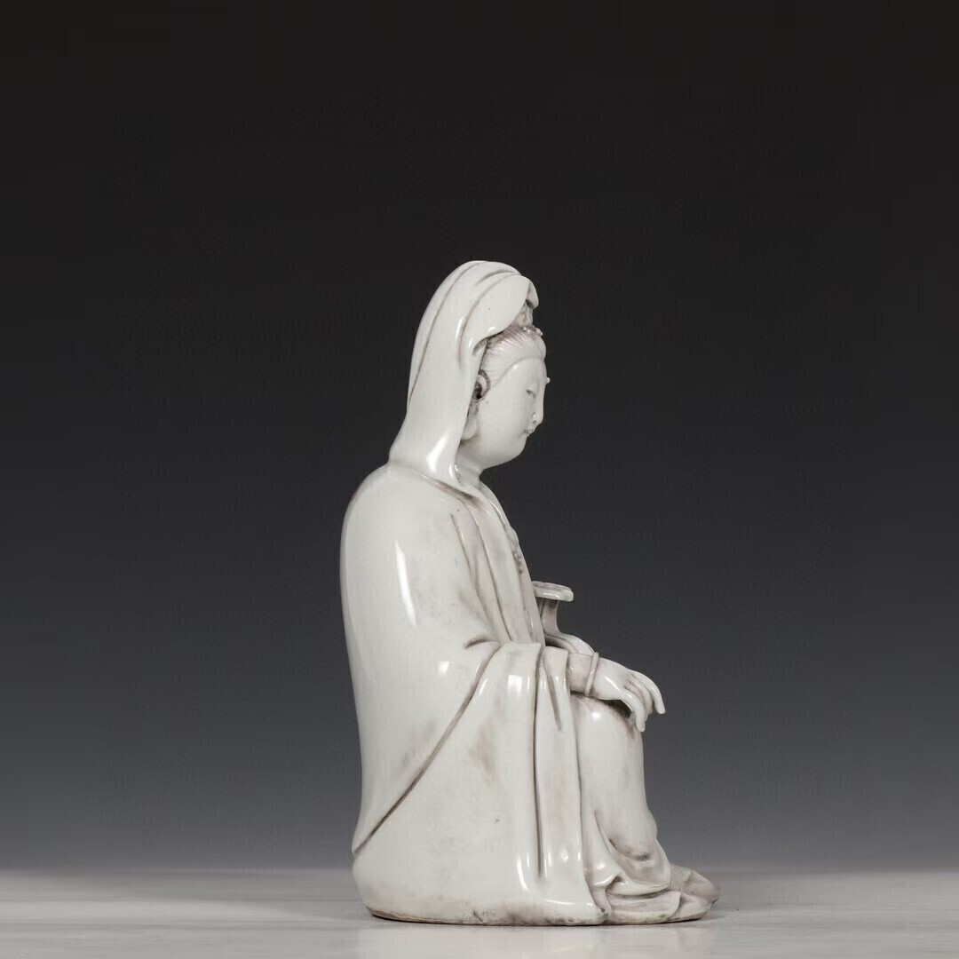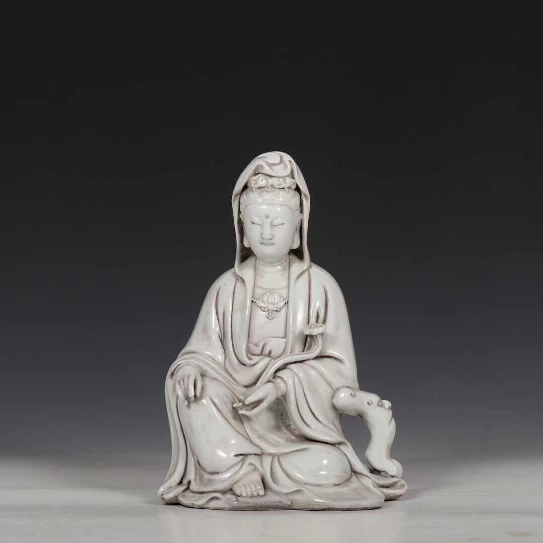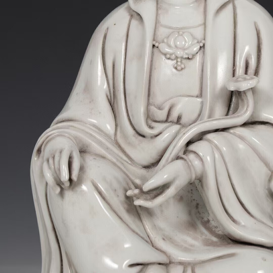 【美の継承】中国古美術 明代 德化窯 牙白釉 観音坐像 如意持手 中国古陶磁 骨董品 時代物 仏像 置物 收藏品 風水 木箱付きR07072421