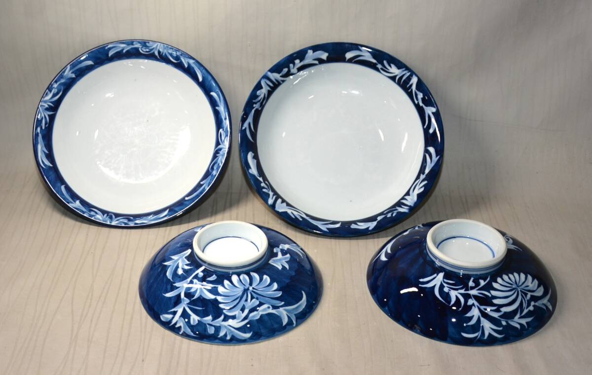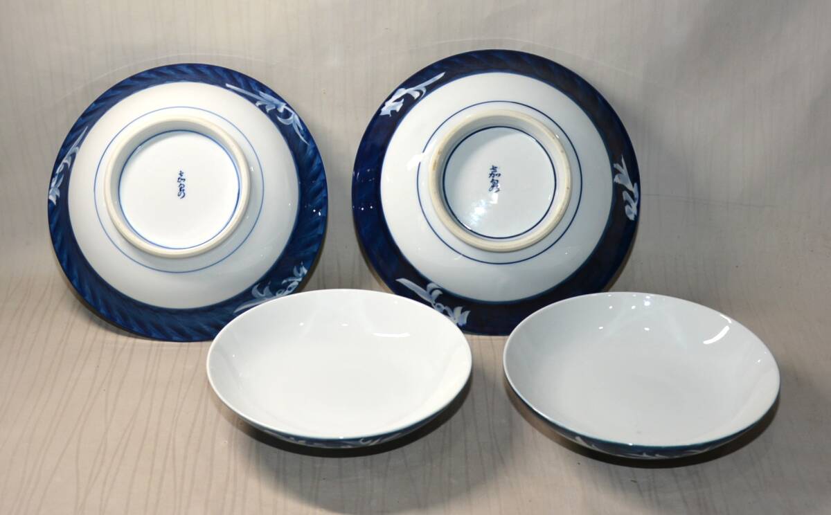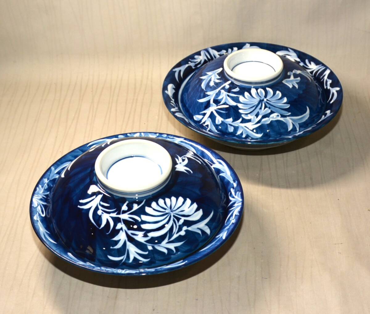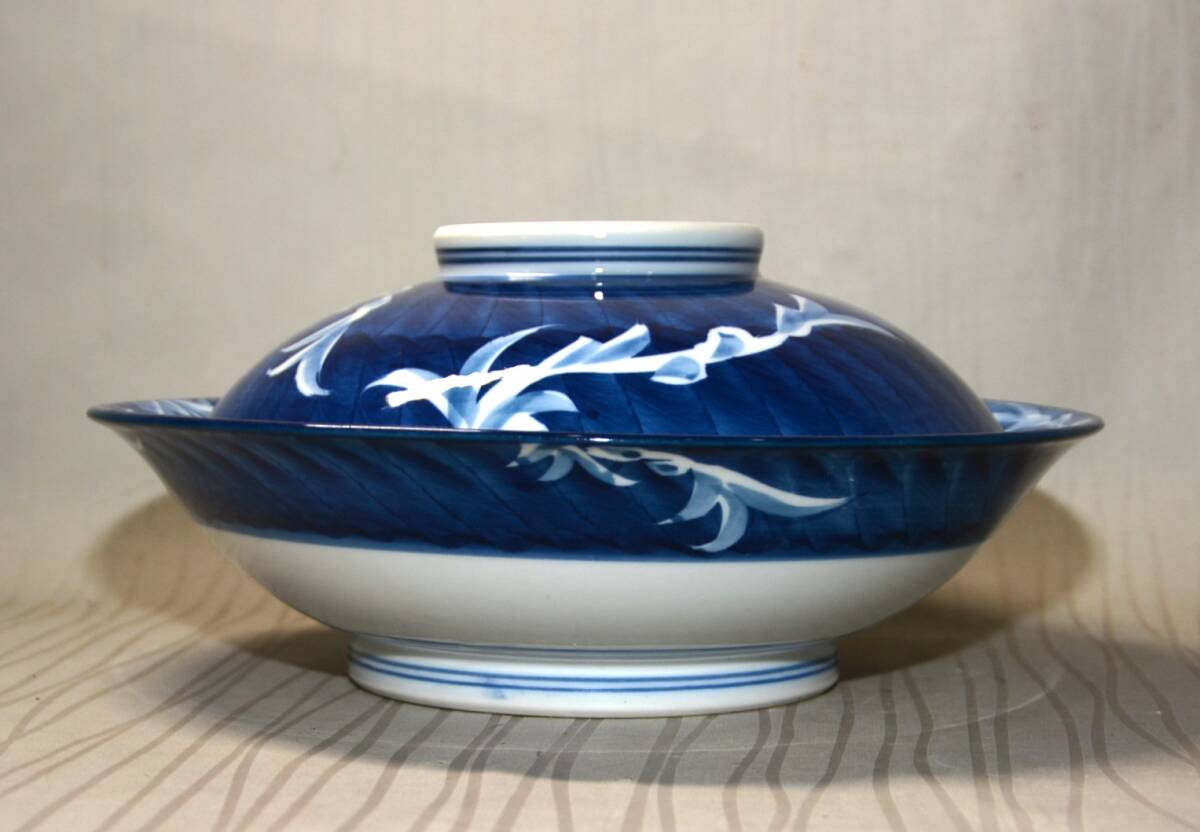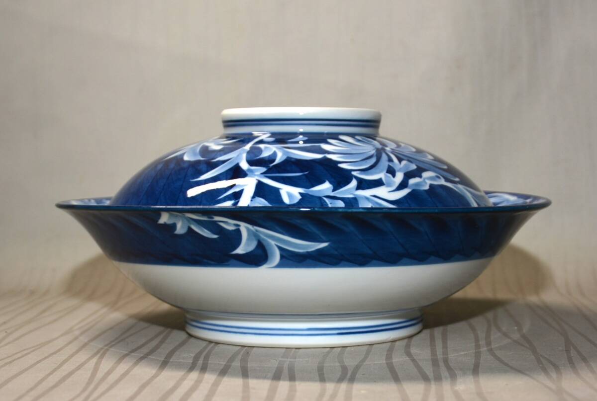 98◆初荷です ◆三川内焼 嘉泉窯 手描染付花文蓋物 平蓋向 2客 24.5cm ◆本体内側使用跡あり 高級和食器