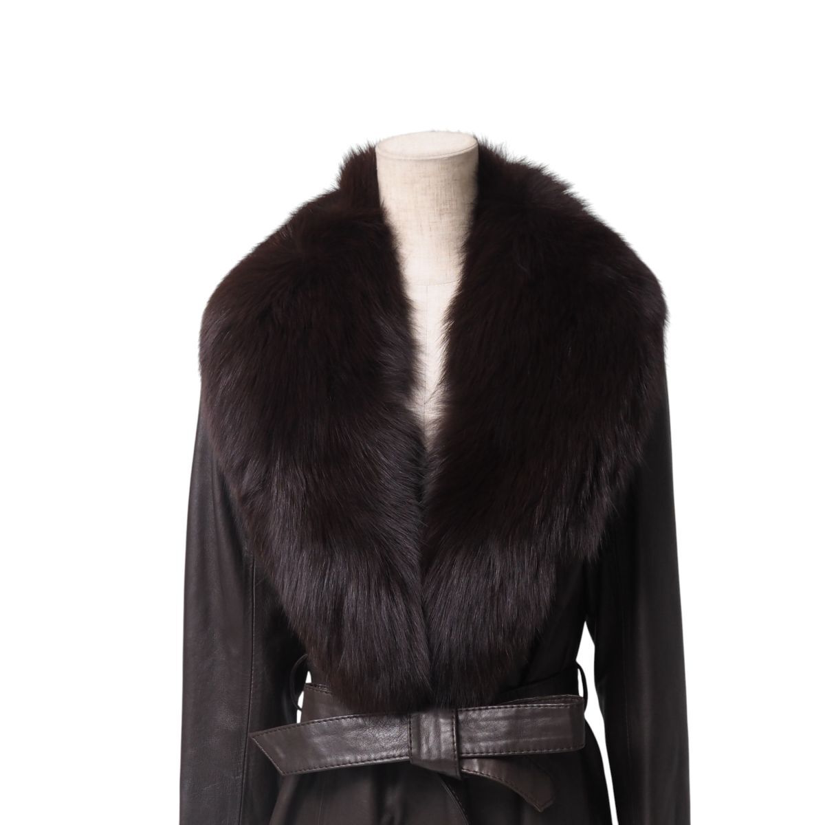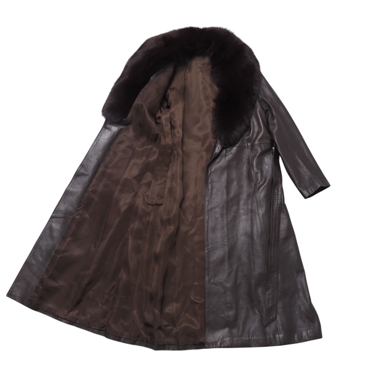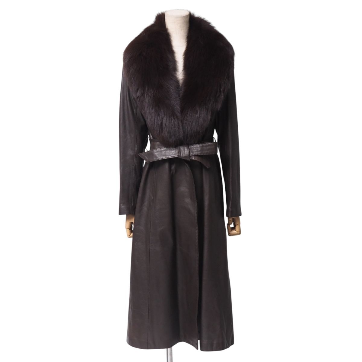 | GS1711▲Partina レザー 本革 フォックスファー襟/着脱可 ベルテッドコート ロングコート レザーコート サイズ13 ダークブラウン | |||
