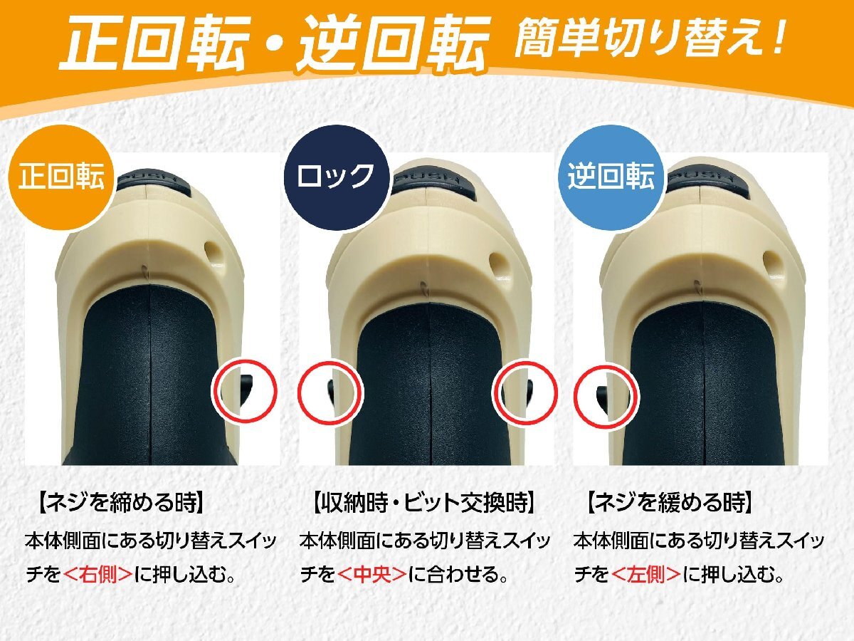 【左右回転切替が可能】正逆転レバーの位置を調整することで、ビットの回転方向を切り替えでき、ネジを締め付けるだけでなく、ネジを緩めることも可能です。