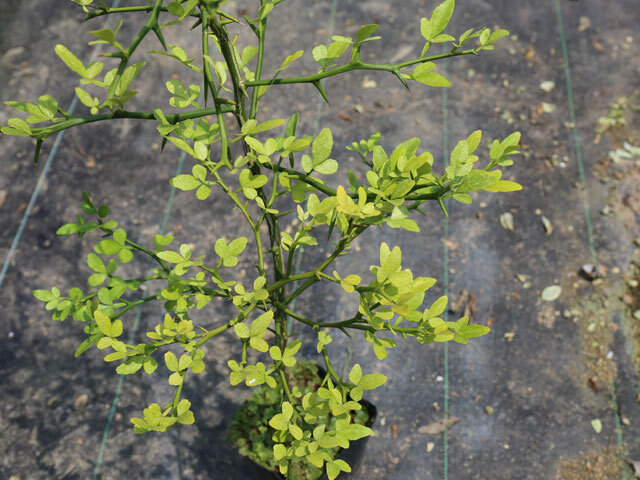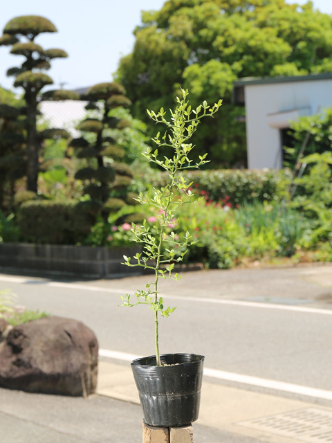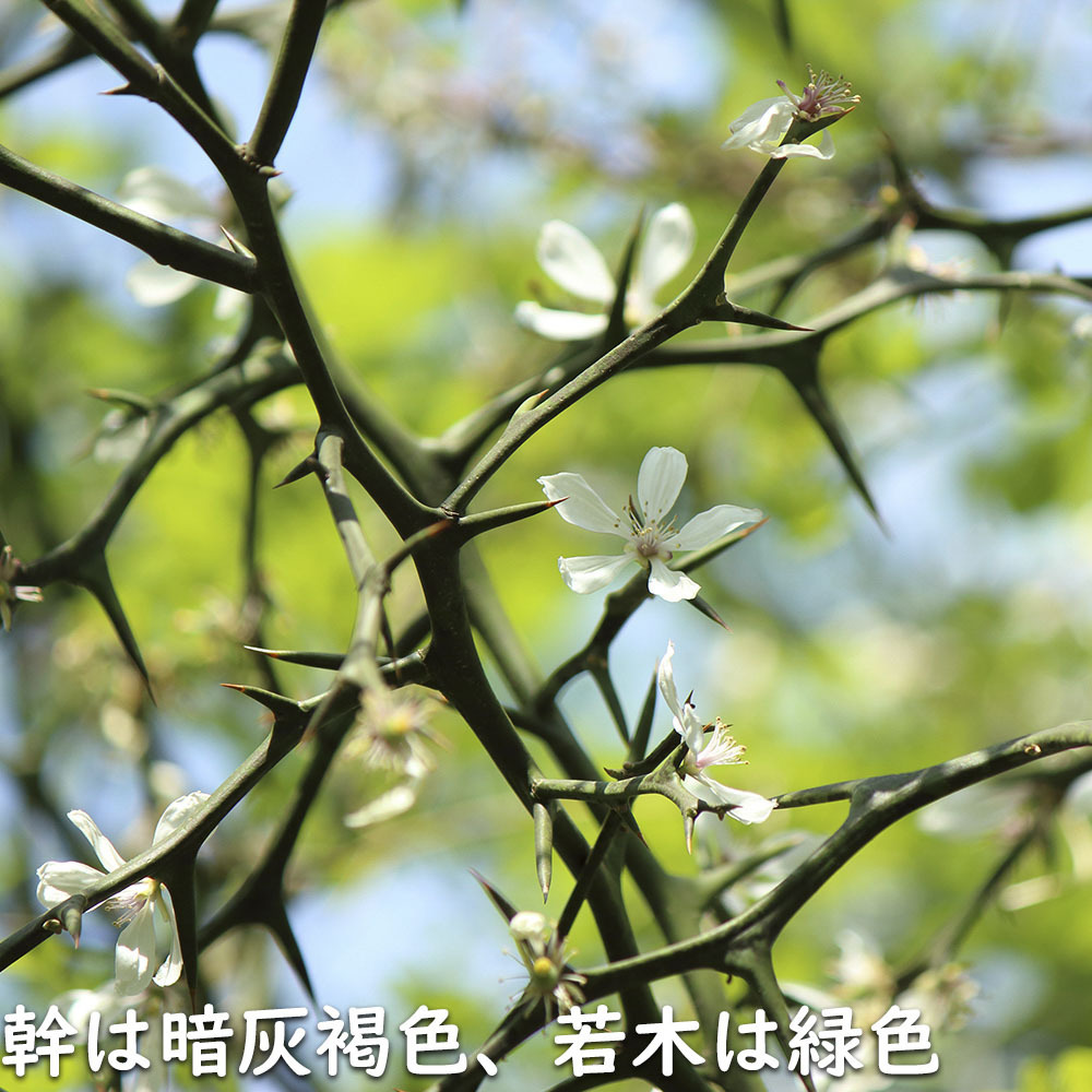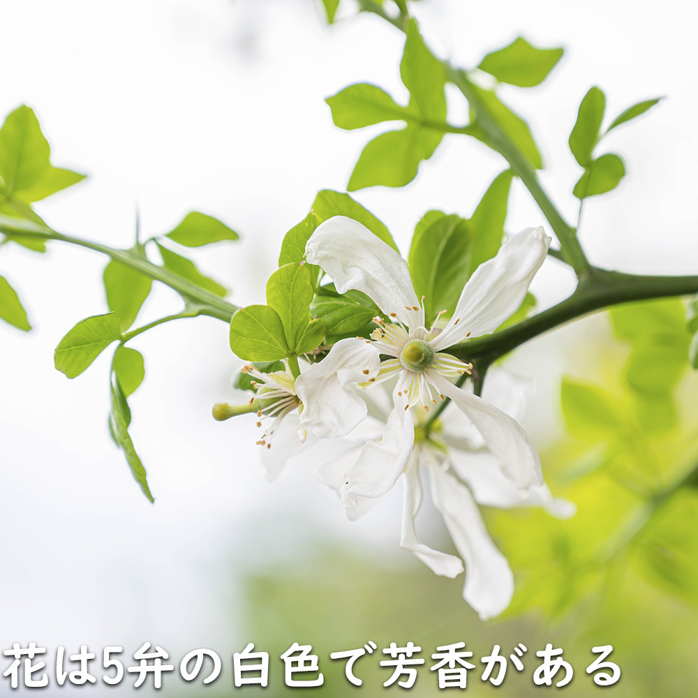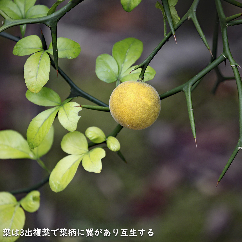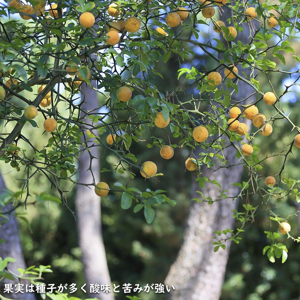 【商品情報】カラタチは3mになる落葉低木です。中国が原産です。葉は互生し3小葉の複葉です。花は5枚の花弁で白い花を咲かせます。幹は鋭いトゲがあります。刈り込んである程度形を自由に仕立てられます。その為、昔から侵入阻止や防犯目的の生垣として利用されてきました。日本で生産する柑橘類の殆どの木がカラタチに接ぎ木して栽培されています。台木にすることにより通常より短い年数で実を付ける木になる等の利点があります。果実は生食には適しませんが果実酒や果実を乾燥させたものは生薬として利用されています。