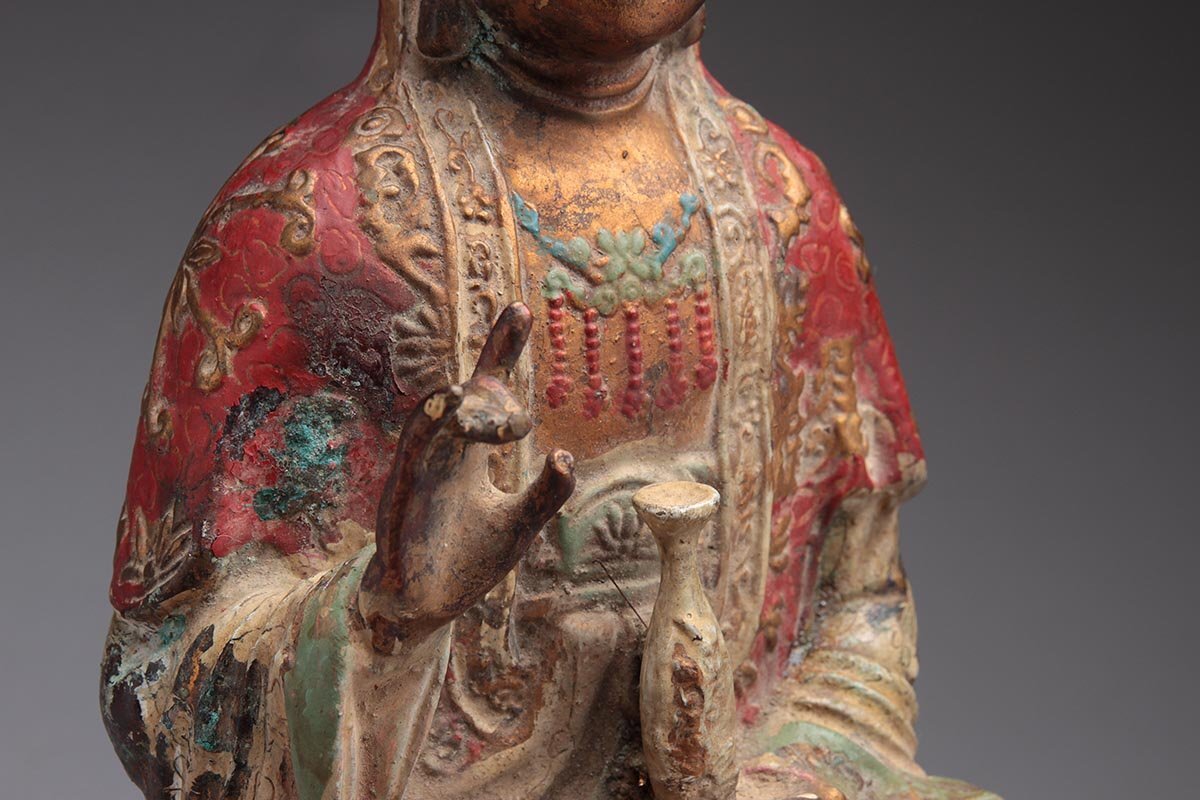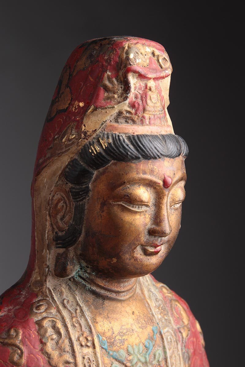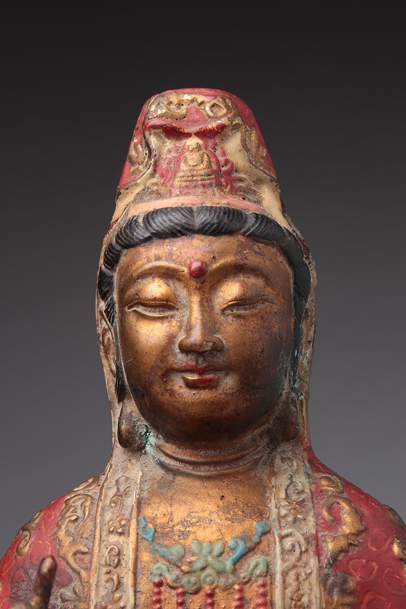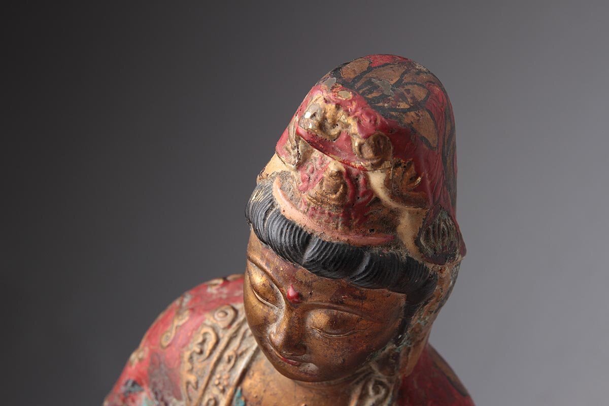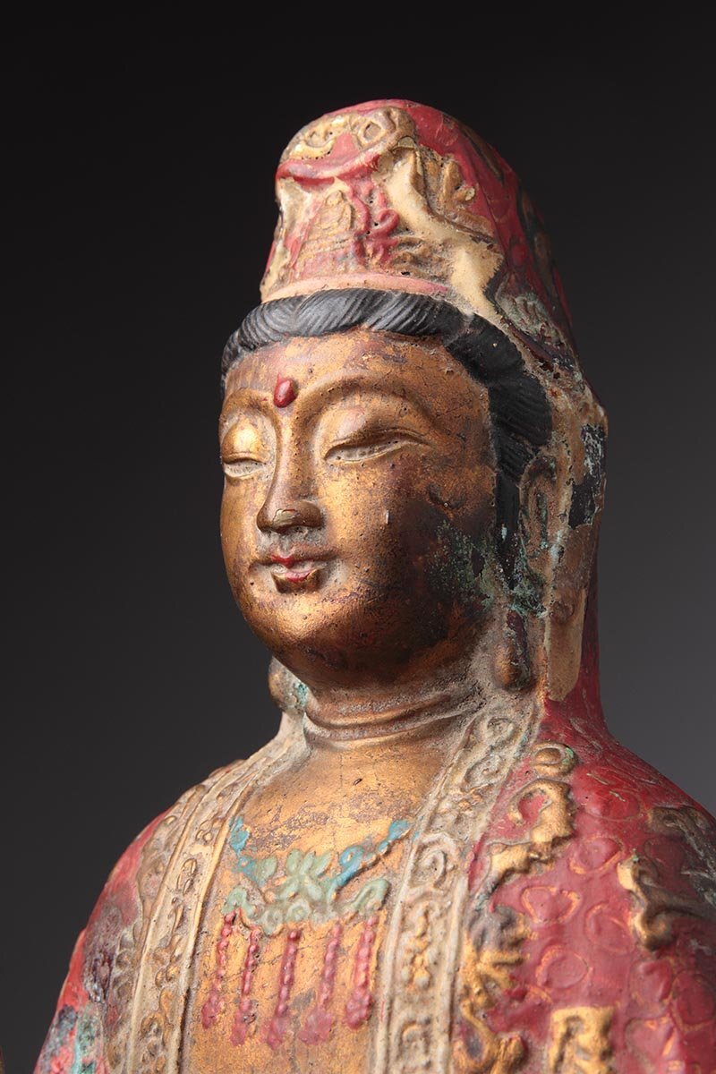 | ◆ 時代仏教美術 銅彩色 金彩「観音菩薩坐像」高27.6cm・銅彩絵觀音菩薩像・仏像 佛像 御本尊 旧蔵 ◆
