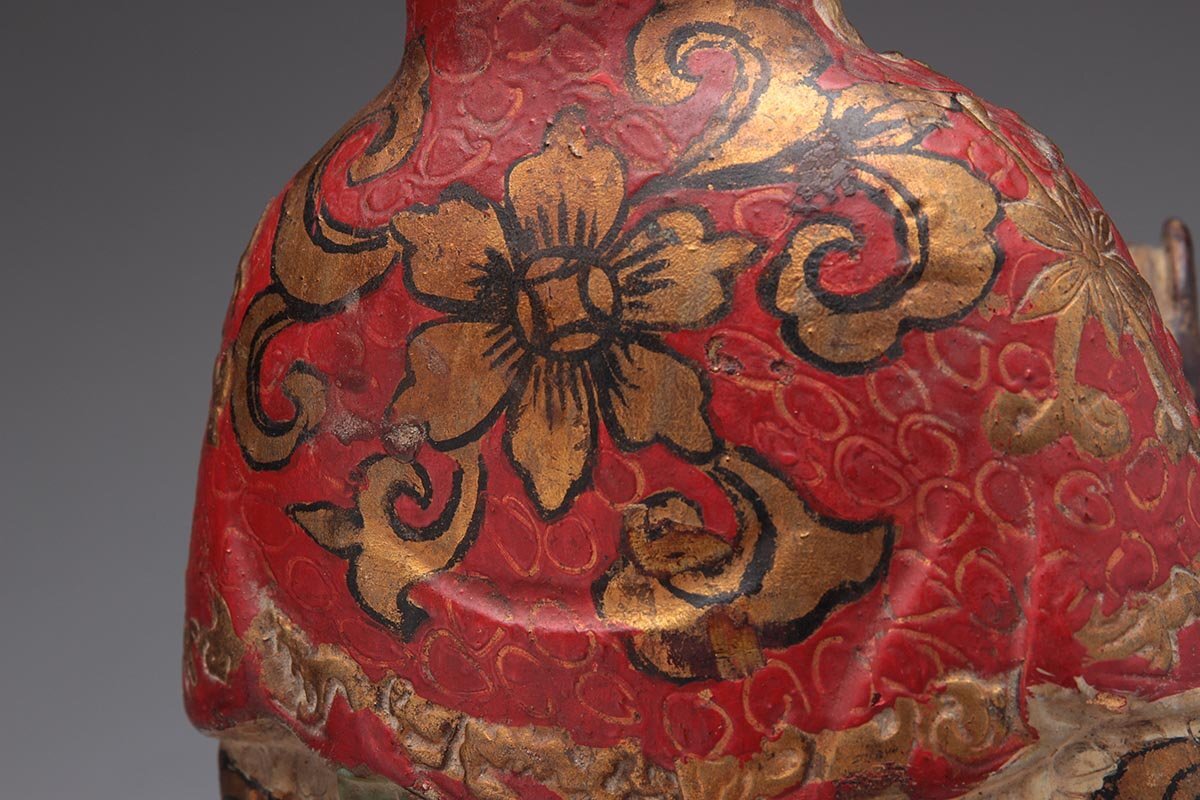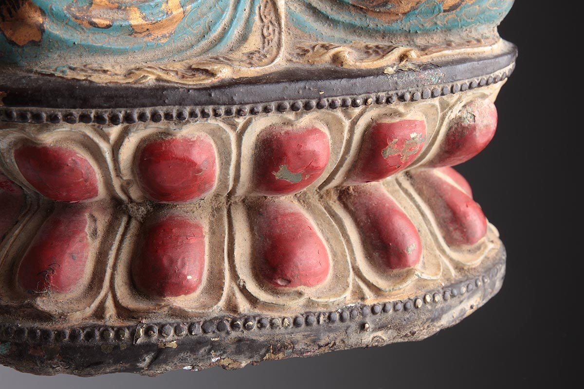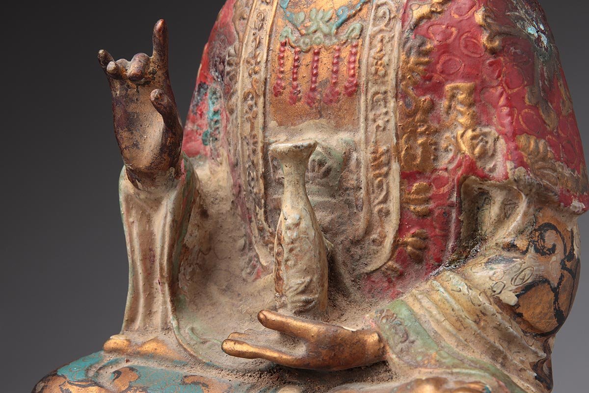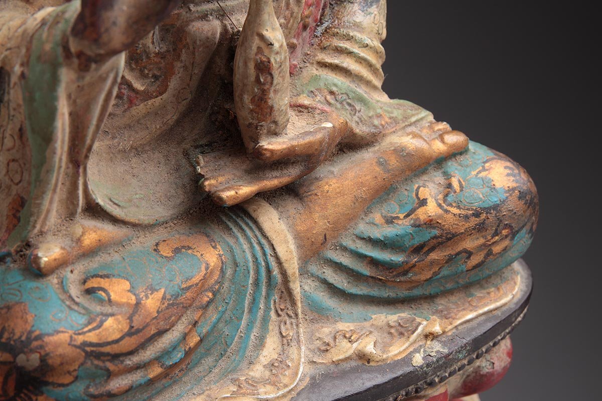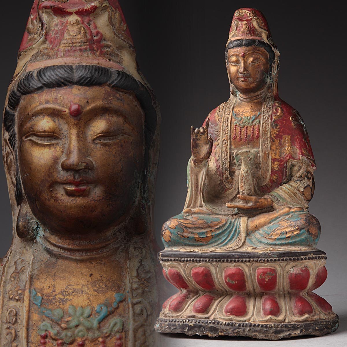 | ◆ 時代仏教美術 銅彩色 金彩「観音菩薩坐像」高27.6cm・銅彩絵觀音菩薩像・仏像 佛像 御本尊 旧蔵 ◆