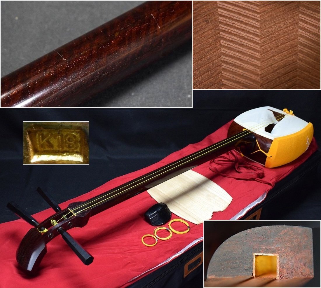 高級『K18極上虎トチ紅木金細子持綾杉二本溝東さわり黒檀糸巻』地唄三味線 ハードケース付 I734-2 |