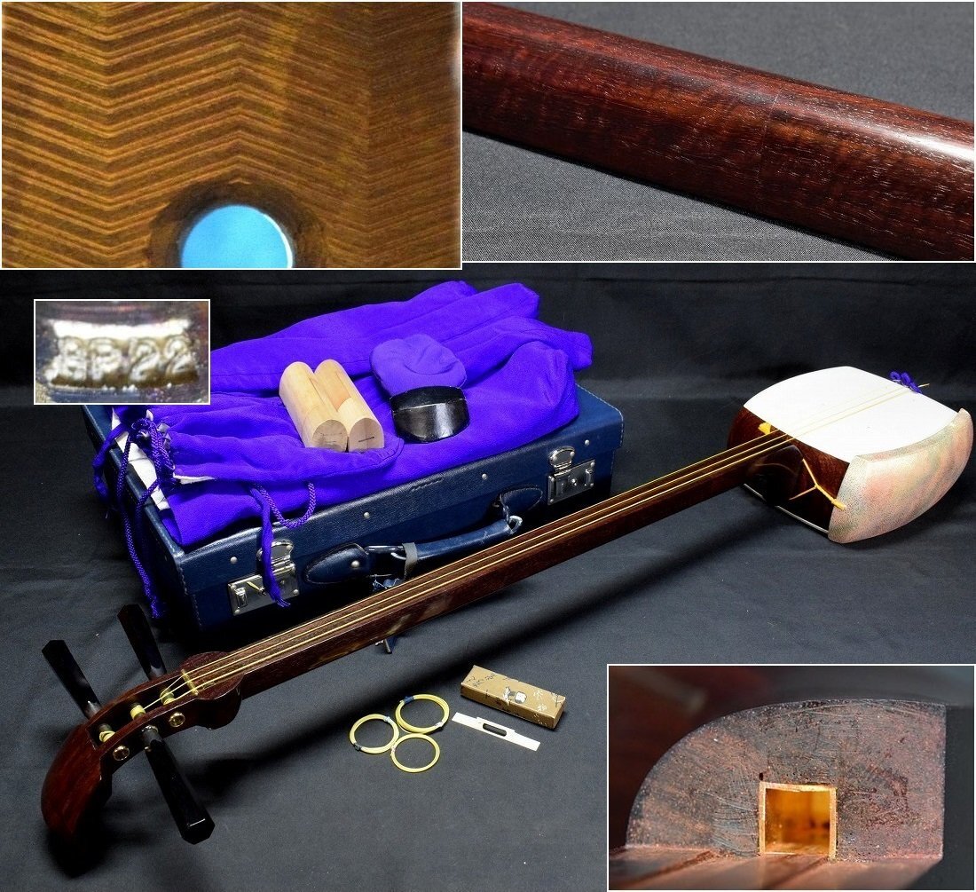 破れなし 高級『GP22虎トチ紅木金細子持綾杉二本溝東さわり糸巻』地唄三味線 ハードケース 袋・駒・合木付 J367 |