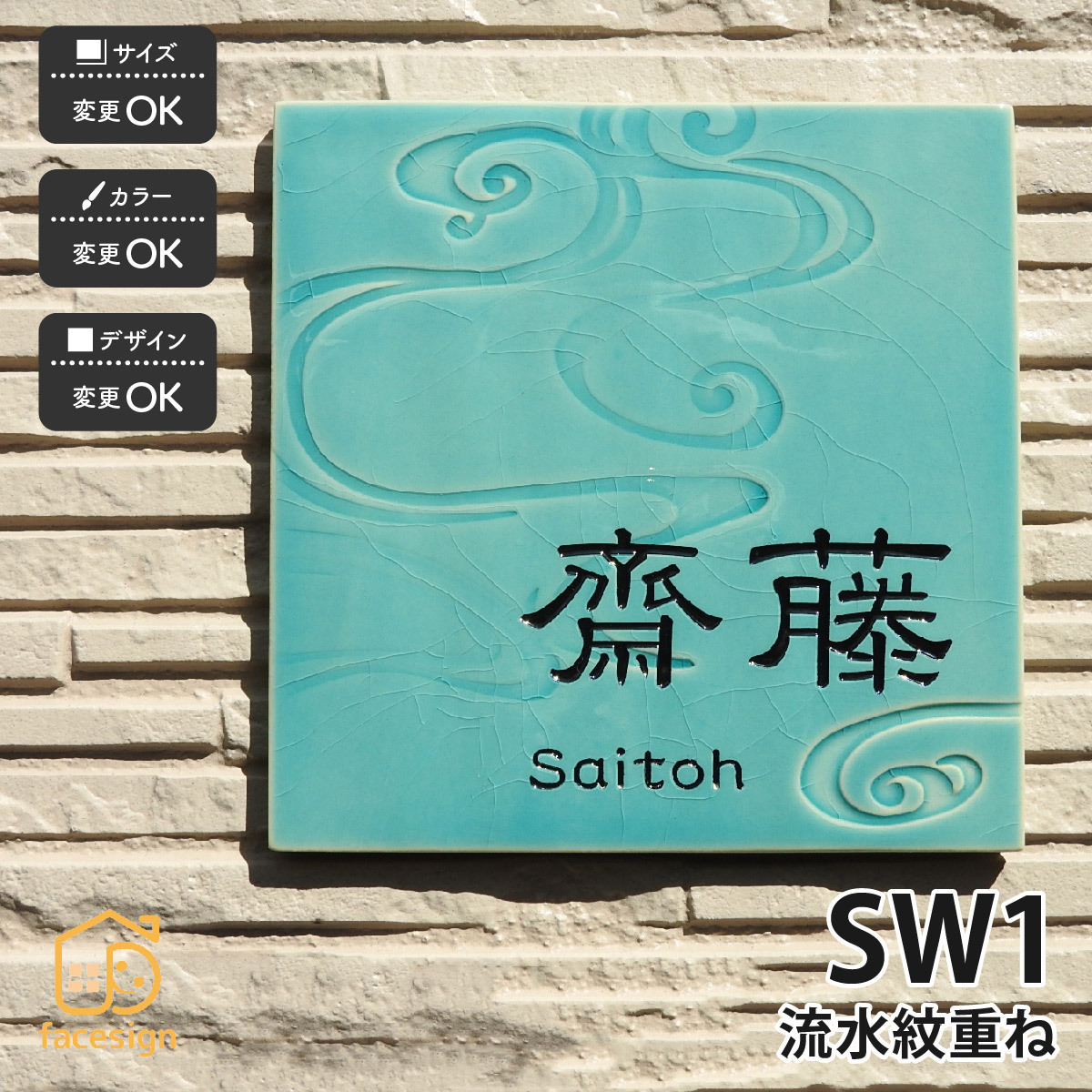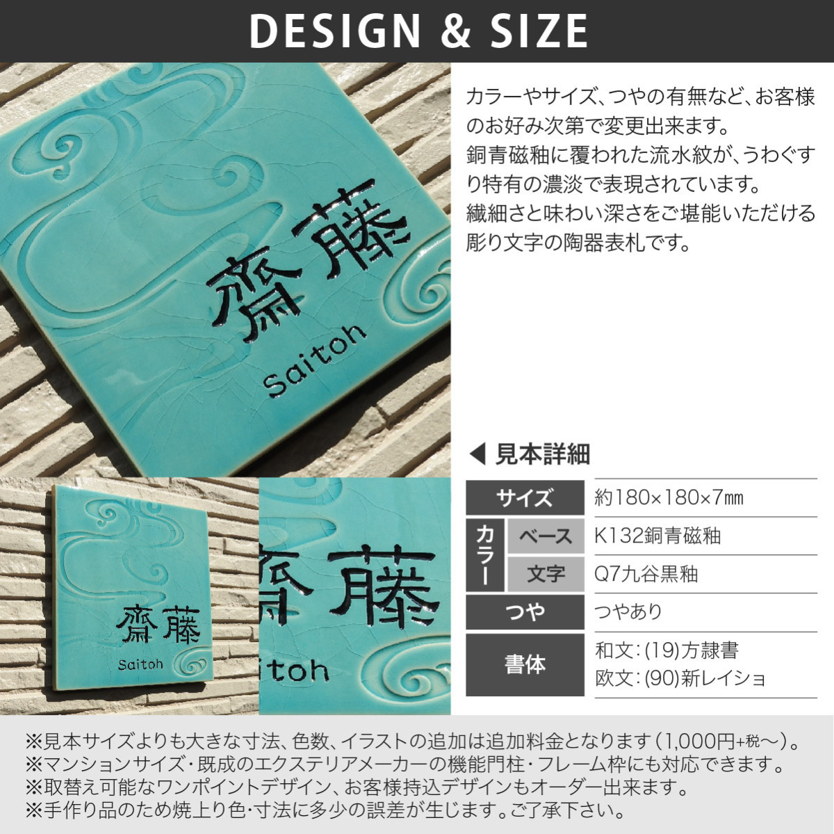 商品詳細 | カラーやサイズ、つやの有無など、お客様のお好み次第で変更出来ます。銅青磁釉に覆われた流水紋が、うわぐすり特有の濃淡で表現されています。繊細さと味わい深さをご堪能いただける彫り文字の陶器表札です。 |