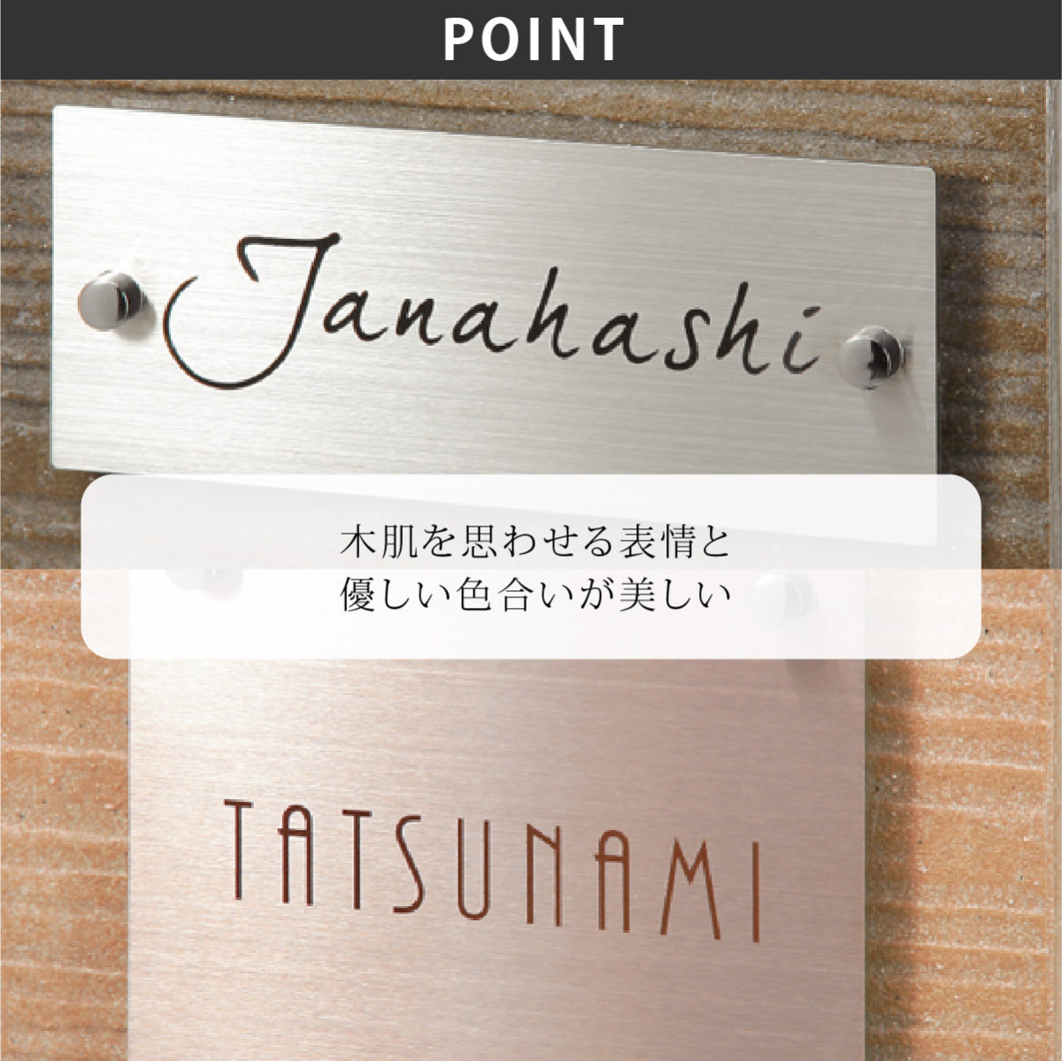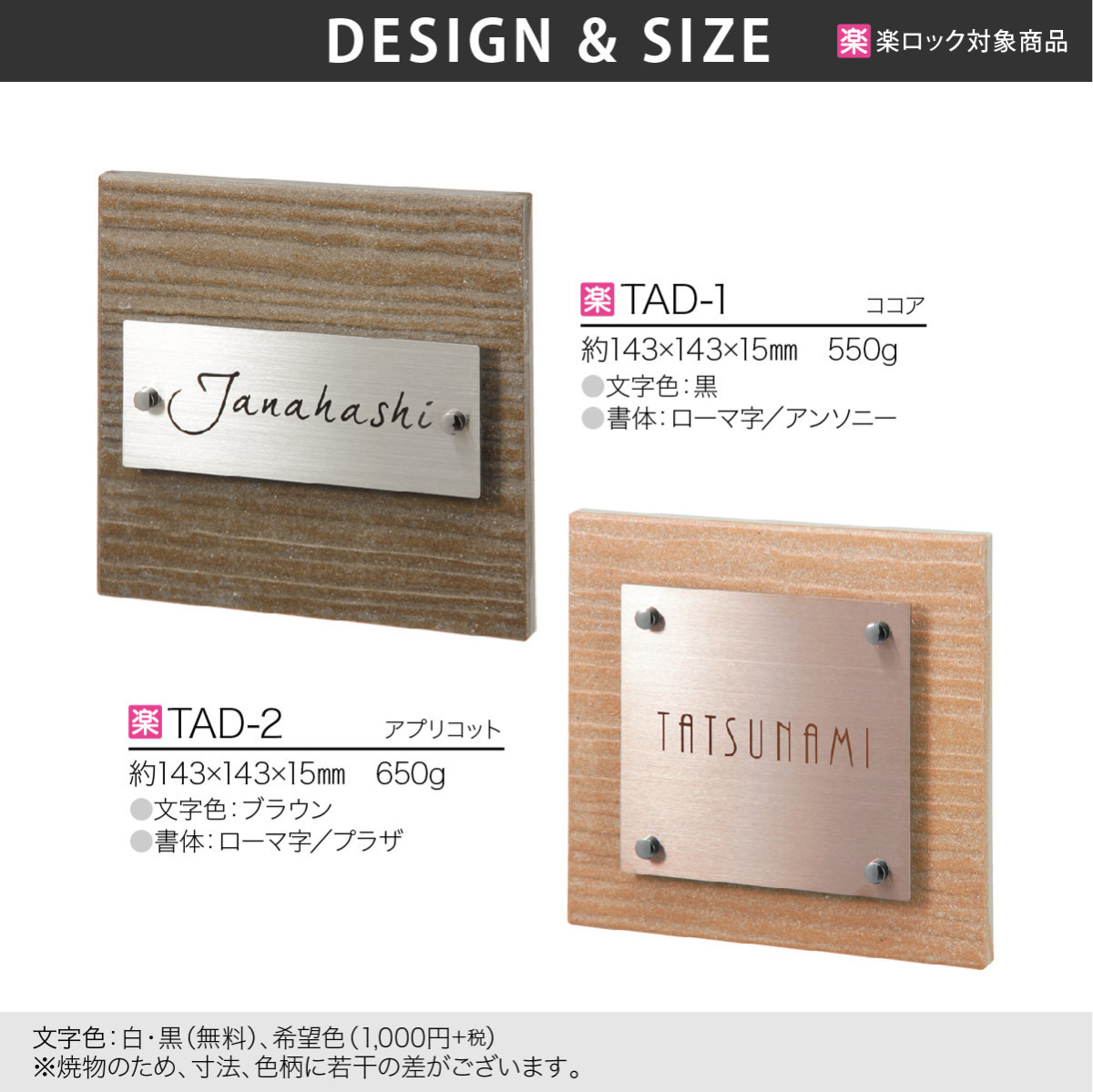 取付方法 | ボルトタイプ:表札裏ボルトと接着剤でのお取り付け。 楽ロック:ボルトと楽ロック専用金具でのお取り付け。 |