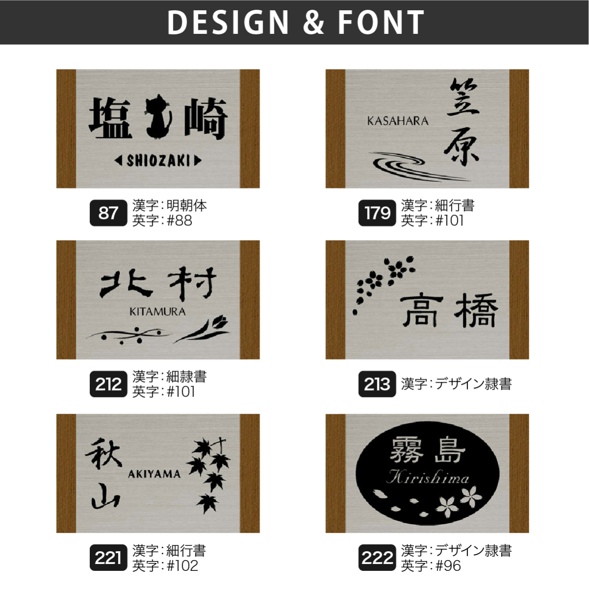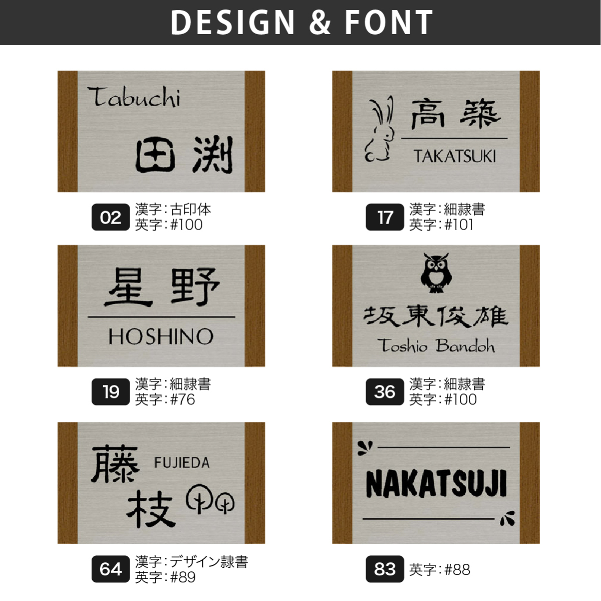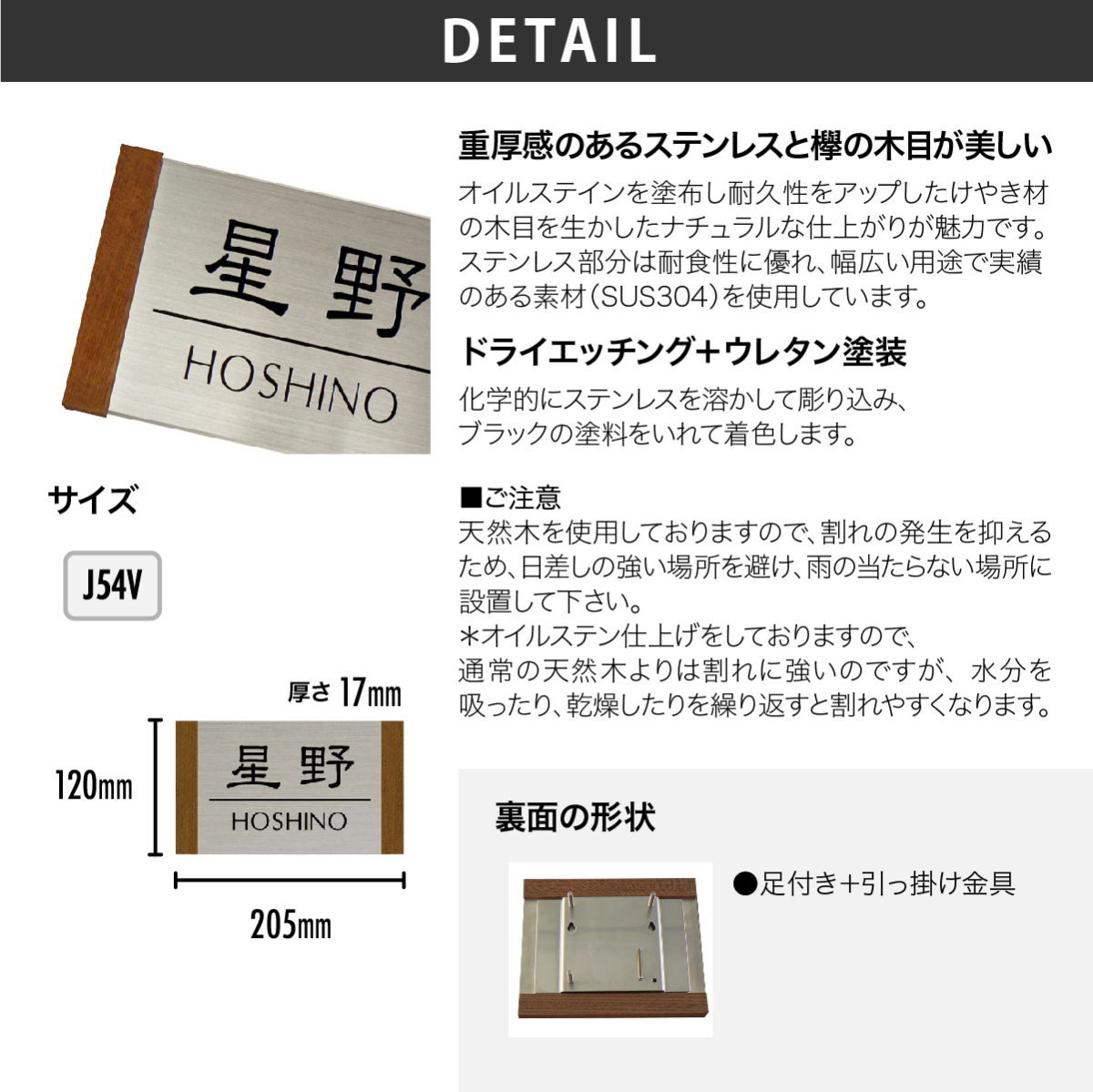 商品詳細 | けやき材を使用し、天然成分由来のオイルステインを塗布し耐久性をアップしました。木目を生かしたナチュラルな仕上がりが魅力の表札です。ステンレス部分はステンレスの中でも耐食性に優れ、幅広い用途で実績のある素材(SUS304)を使用しています。ドライエッチングにより金属表面に微細な凹凸をつくり塗料の密着性を高めてから塗装します。塗料は自動車などにも使用される耐久性の高いウレタン塗料で塗装していますので屋外でも安心してご使用頂けます。 |