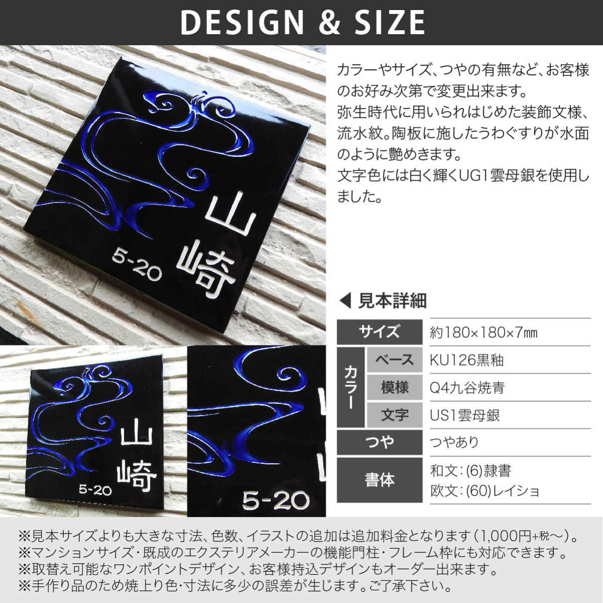 商品詳細 | カラーやサイズ、つやの有無など、お客様のお好み次第で変更出来ます。弥生時代に用いられはじめた装飾文様、流水紋。陶板に施したうわぐすりが水面のように艶めきます。文字色には白く輝くUG1雲母銀を使用しました。 |