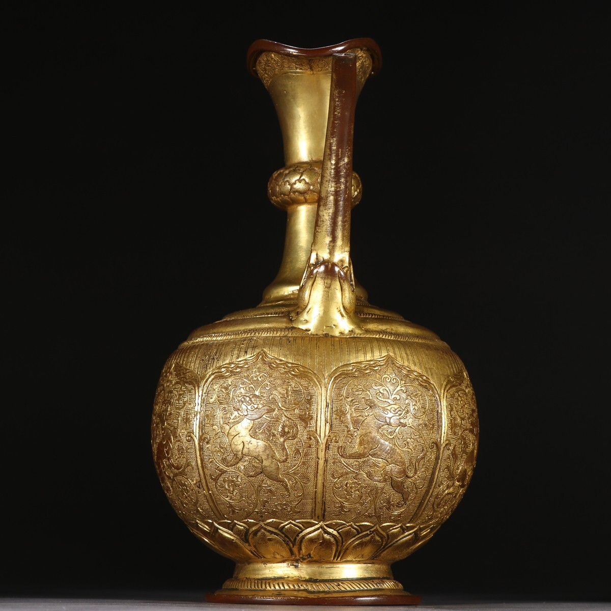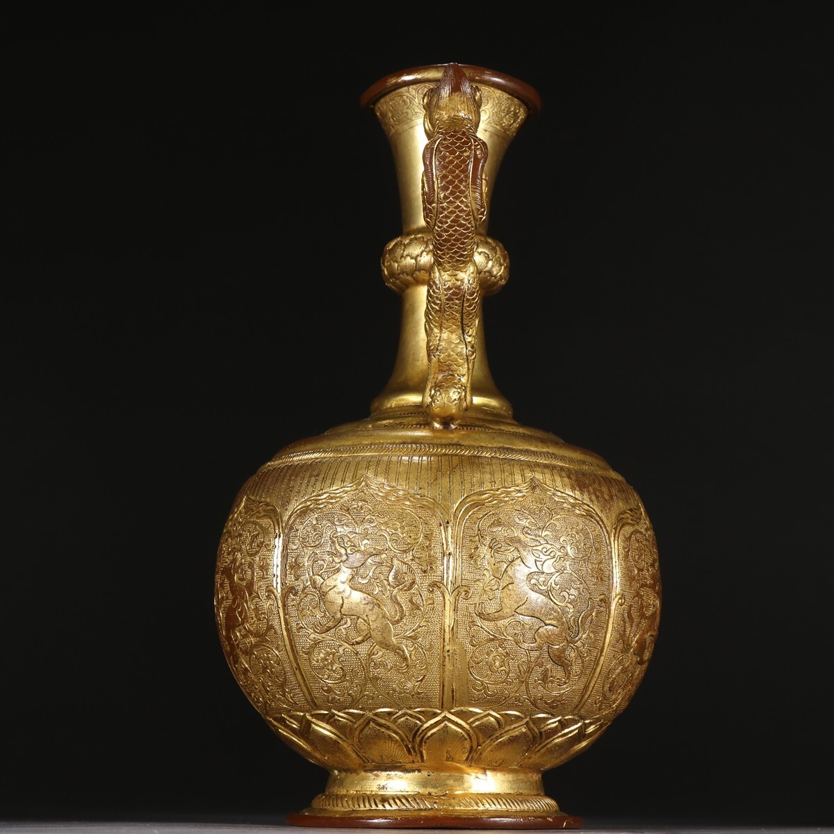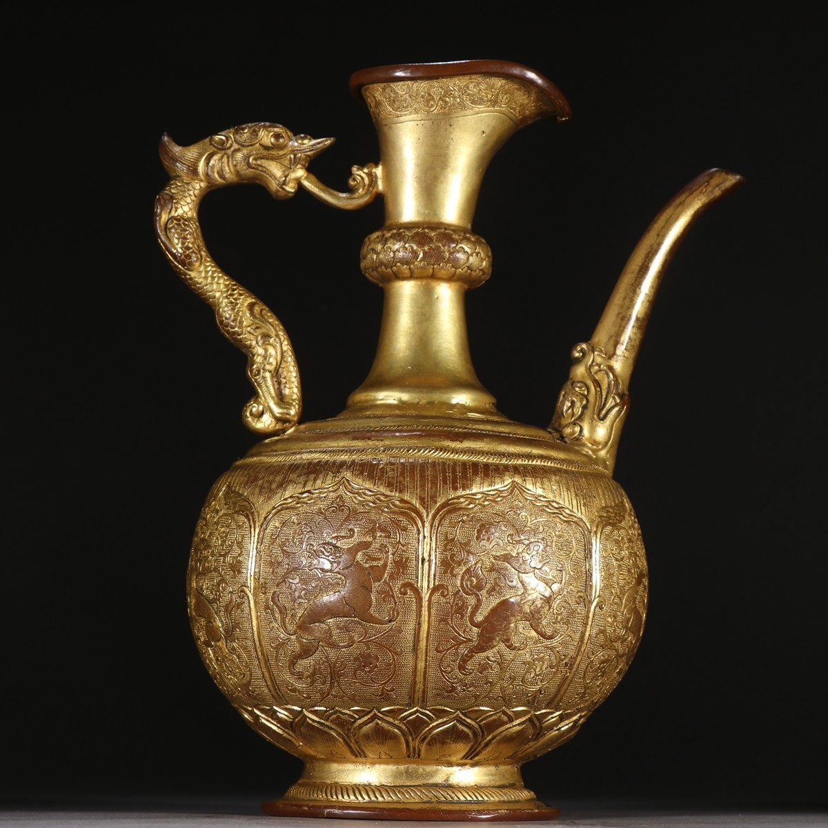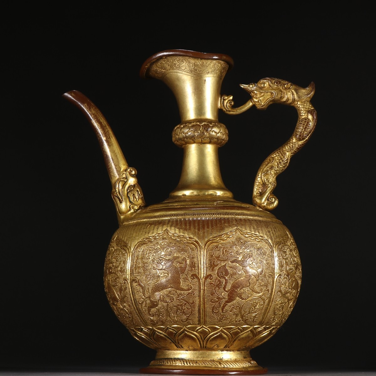 【瓏】古銅鏨刻彫 塗金纏枝古獣紋 龍柄酒壺一対 唐代 古置物擺件 銅器 中国古賞物 蔵出