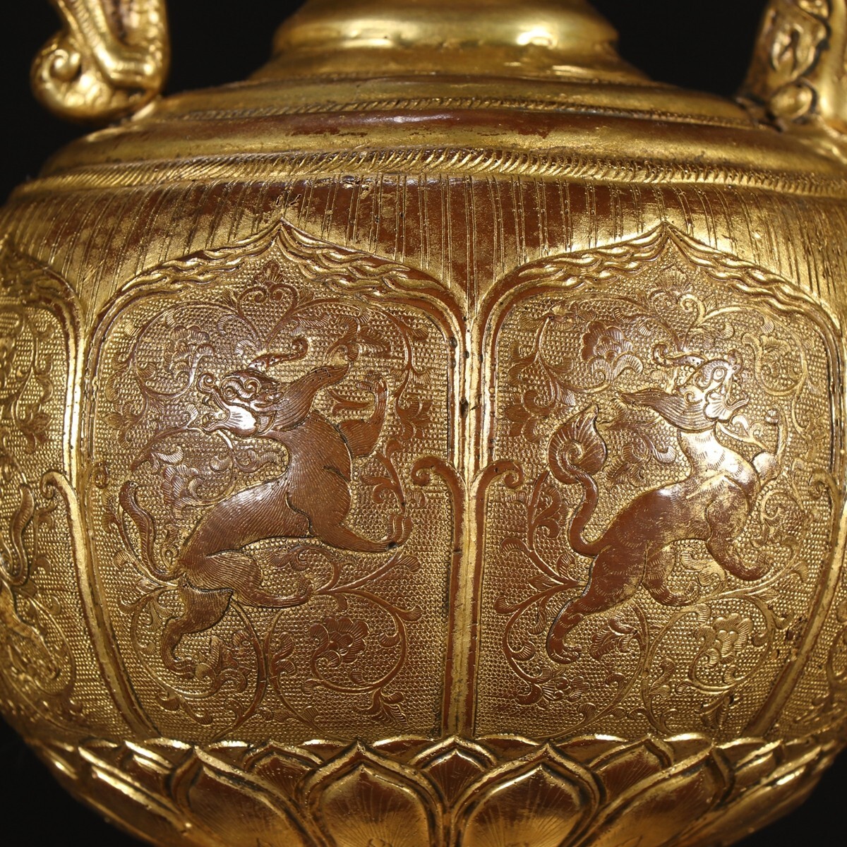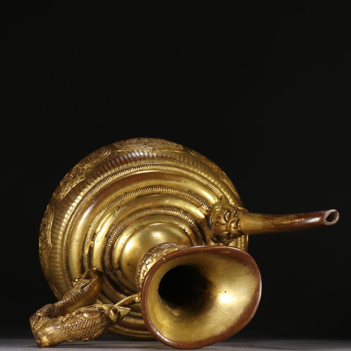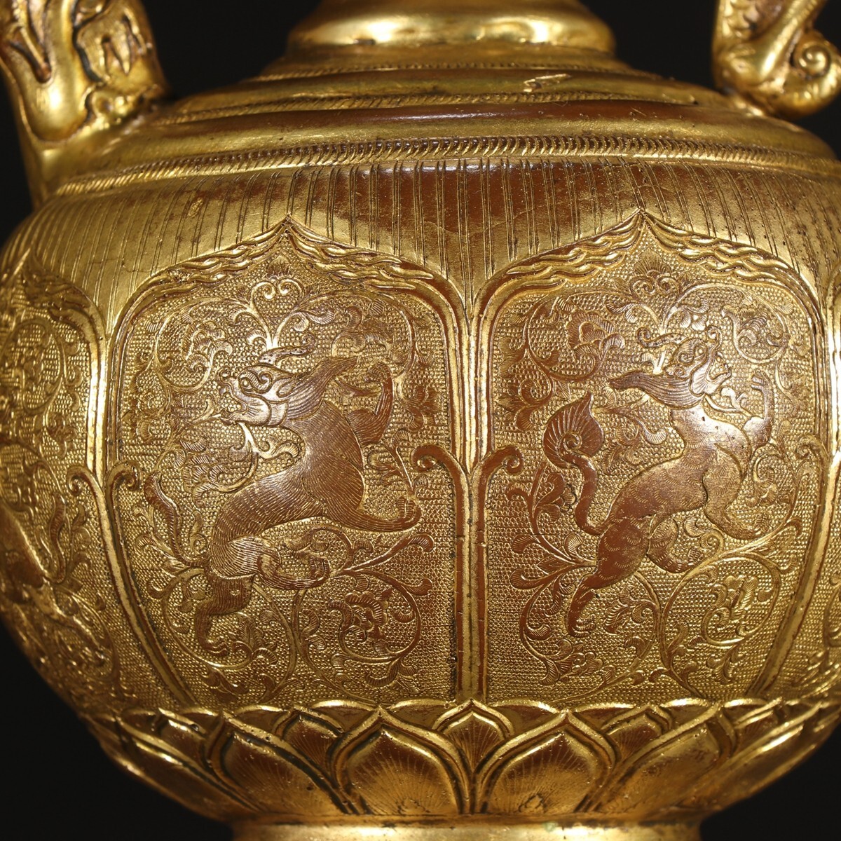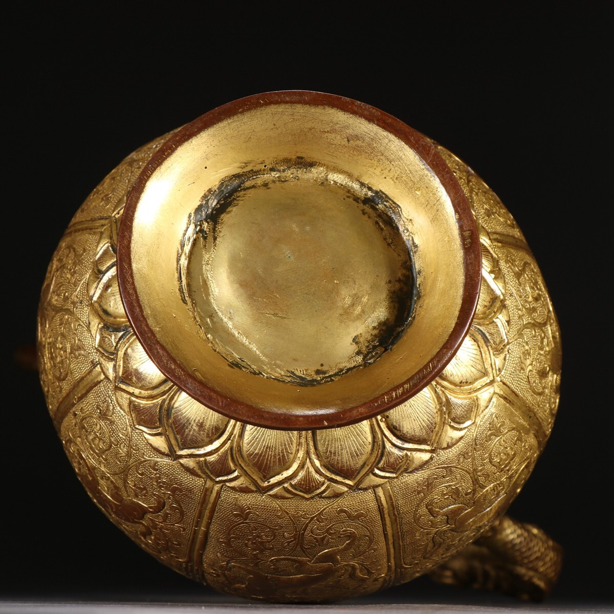 【瓏】古銅鏨刻彫 塗金纏枝古獣紋 龍柄酒壺一対 唐代 古置物擺件 銅器 中国古賞物 蔵出