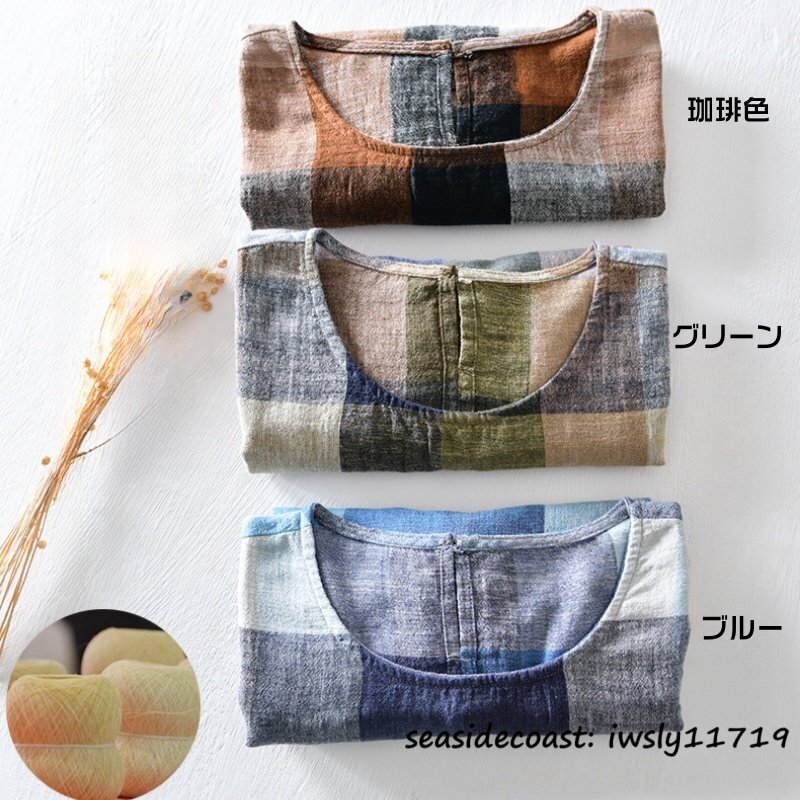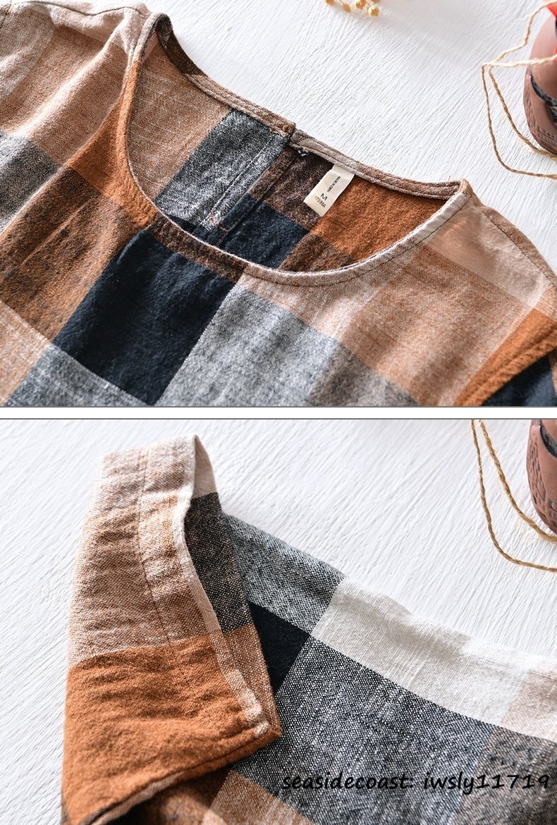 新品★メンズシャツ 半袖シャツ リネンシャツ Tシャツ 丸首 チェック柄 夏 summer 綿麻シャツ サマー 心地良し カジュアル 珈琲色 L