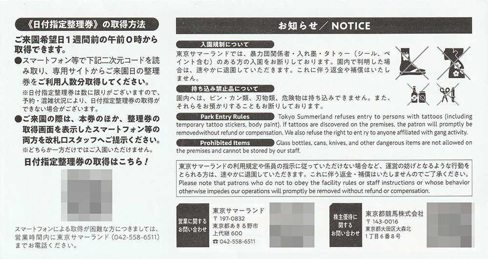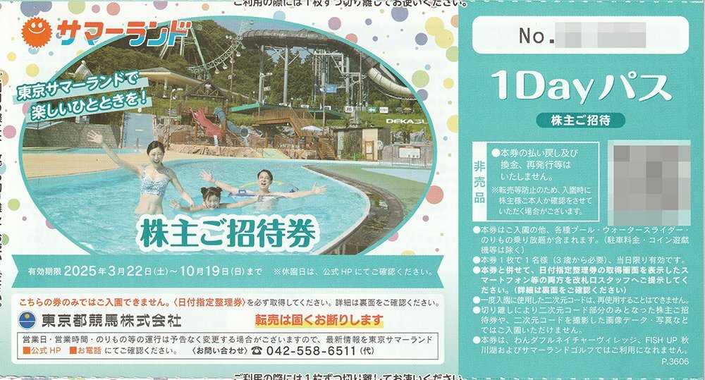 | 出 品 商 品 | 東京都競馬株式会社 東京サマーランド株主ご招待券 1Dayパス 4枚+春秋限定 株主ご招待券 1Dayパス 4枚 (8枚セットの価格となります) |