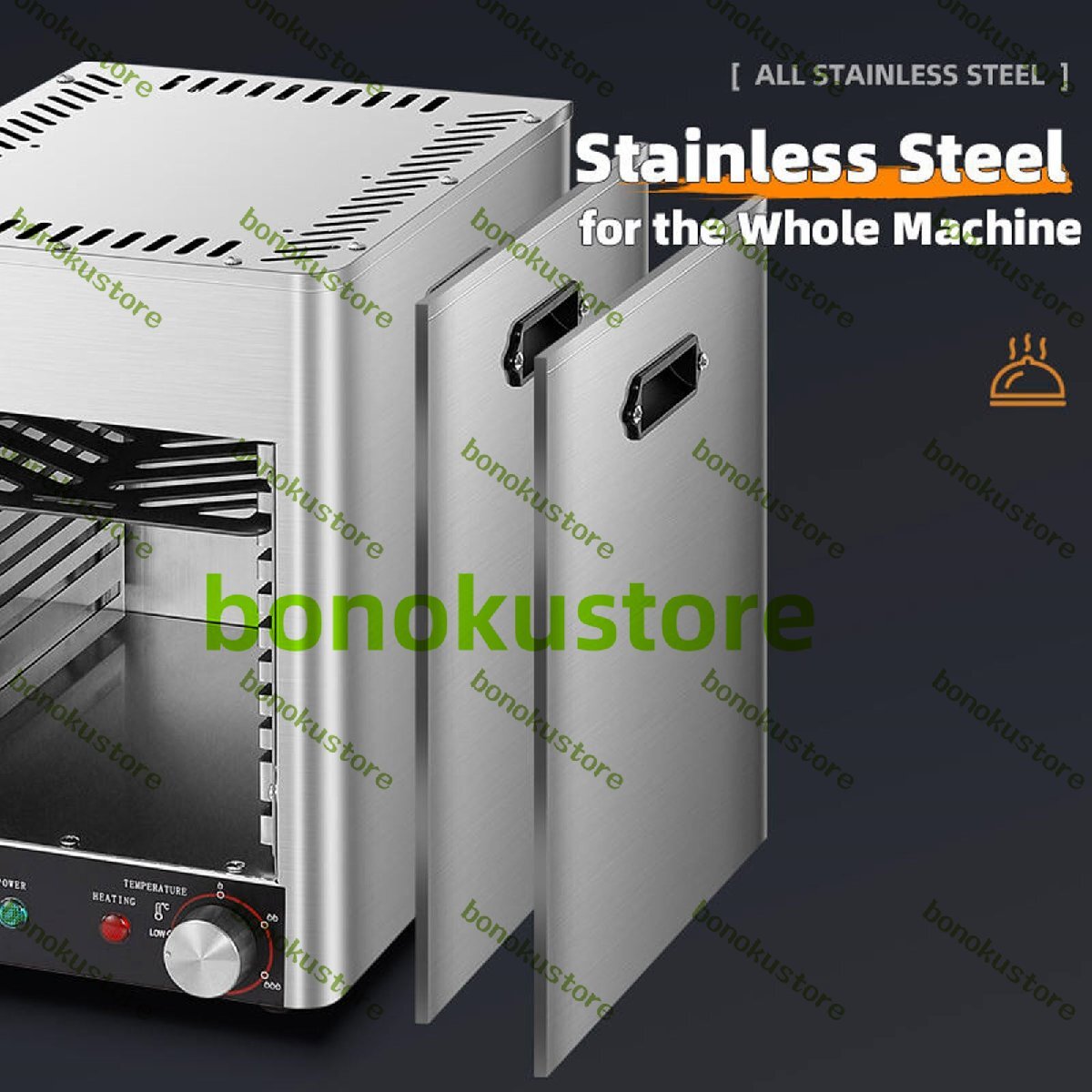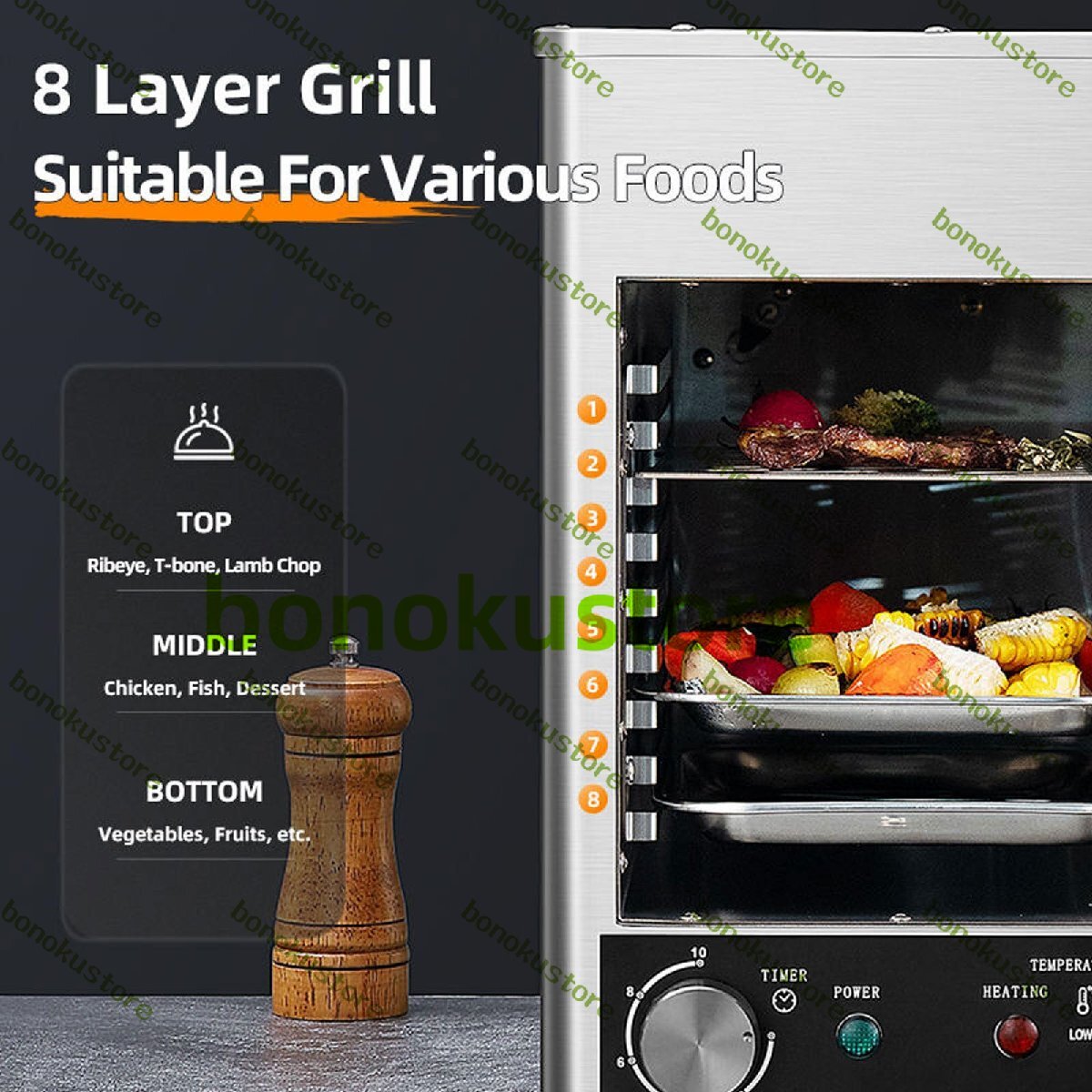 デザイン:卓上グリルには、高さの異なる8つのグリルスロットがあります。食材に合わせて最適な焼き加減をお選びください。レベル1~3はリブアイステーキ、Tボーンステーキ、ステーキに適しており、レベル4~6は鶏肉、魚、デザートに適しており、レベル7~8は野菜や果物に適しています。