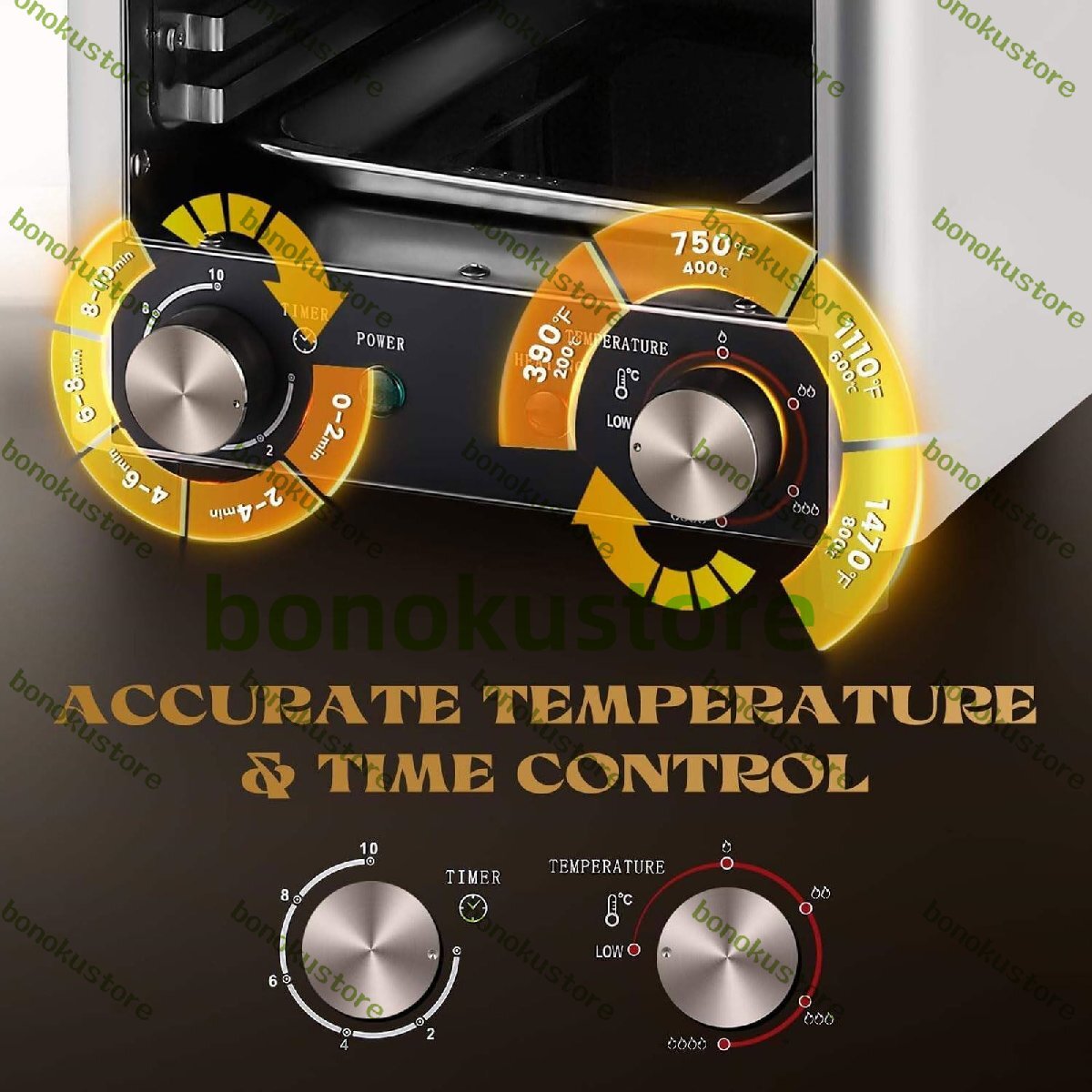 精密な制御:時間:0~10分|温度:200~800℃(392~1472°F)、200℃刻み|無段階調整ノブを備え、お好みや調理のニーズに合わせて温度と時間を自由に調整できます。