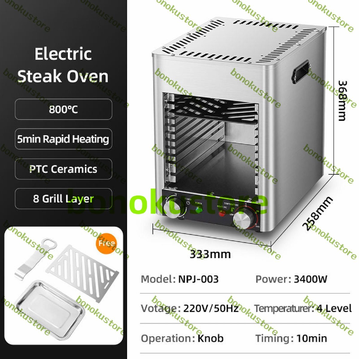 付属品:ステーキオーブンには、ステンレス製グリル、グリルハンドル、グリルパンなど、様々な必須アクセサリーが付属しています。これらのアクセサリーは、様々な調理オプションを提供し、料理体験を向上させるための必要なツールを提供します。