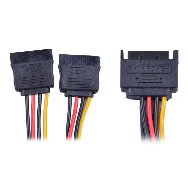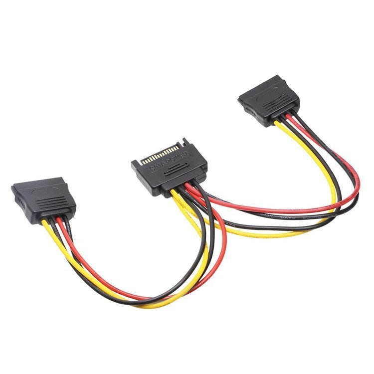 2つのSATA 15ピン(メス)コネクタと1つのSATA 15ピン(オス)コネクタを搭載したSATA電源分岐ケーブルにてパソコンの電源を二つのSATA HDD、SSD、光学式ドライブ、DVDバーナー、およびPIC-Eカードと接続できます
