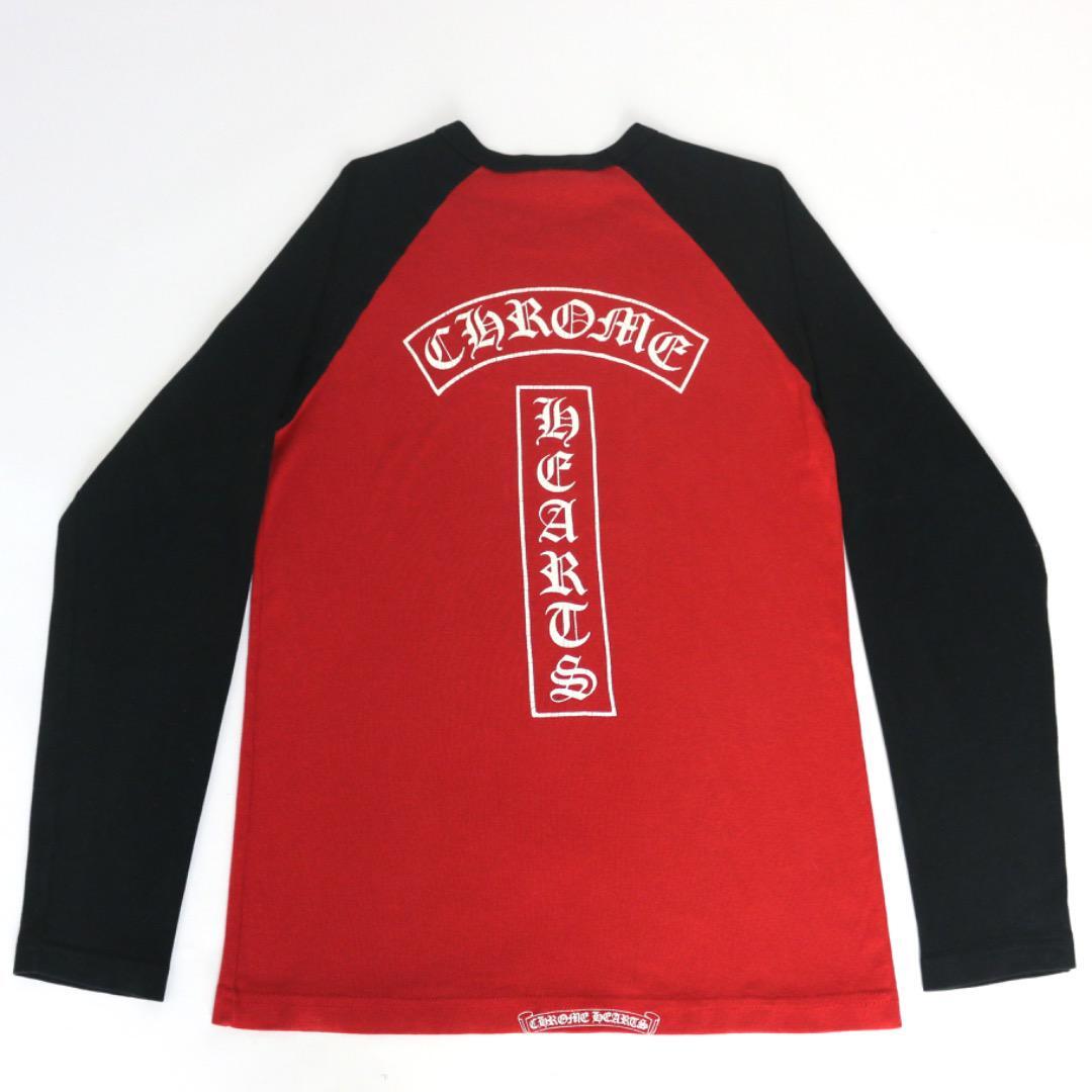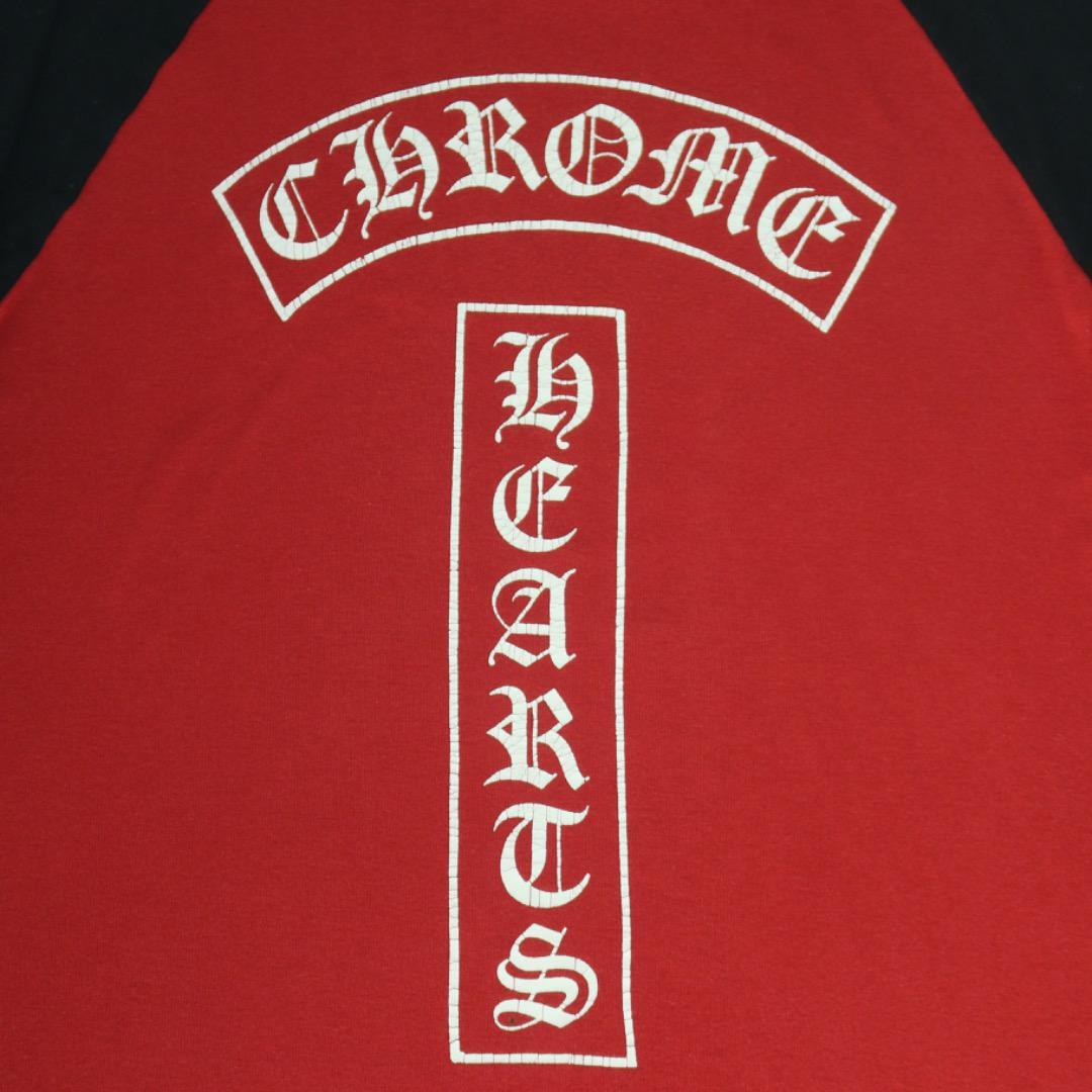 ご覧い頂きまして有難うございます。 Chrome Heartsの歴史は・・ 1988年にリチャード・スターク(Richard Stark)達がシルバーアクセサリー・ジュエリーのブランドとして設立したのが、クロムハーツ(Chrome Hearts)です。 革製品のセールスを生業としていた頃、彼はハーレーダビッドソンで全米中をセールしてまわっていました。 その時に同業者のジョン・バウマン(John baumann)と知り合って意気投合し、共同で事業を始めるようになります。 2人はそのビジネスの傍らで、既存のメーカーのバイク用ファッションにどうしても満足できず、自分たちが身に着けたいと思う物を自分たちで作りたいと思うようになり、やがて、彫金職人であったレナード・カムホート(Leonard Kamhout)を巻き込んで、本格的にバイク用ファッションのビジネスをスタートさせました。 これがいわゆるクロムハーツを創業したとされる3人の出会いです。 もとはレザークラフトから始まった弱小ブランドですが、今現在のクロムハーツの核になるアイテムはシルバーアクセサリーであり、そのルーツとなるのが天才彫金師レナード・カムホートが存在です。 レナード・カムホートの存在が無ければ現在のクロムハーツの成功と繁栄は有り得ません。 クロムハーツのコンセプトは「唯一無二の存在」 最高峰の彫金技術が創りあげる骨太なラグジュアリー 他の追従を許さない独自のを展開するクロムハーツが手がけるレザーアイテムは、無骨でありながらもシックでゴージャス。 アイテムは2007年にクロムハーツ東京で購入した 限定Tシャツに成ります。 ラグランスリーブで赤色と黒色の袖の切返しが有り、プリントは背中面には全盛期中期に採用されてた長方横形枠の中には「CHROME」長方縦形枠には「HEARTS」のバックプリントと腰には定番の「CHスクロールラベル」プリント。 表面は胸元には「セメタリークロス」プリントで構成された希少なヴィンテージ ロング Tシャツです。 シーズンを問わず着用できるモデルなので、クロムハーツのアパレルアイテムの中でもひと際は人気の商品にさらに限定感をだしたレアな廃盤品です。 アイテムはクロムハーツの荒々しい歴史に名を残す中期モデルの希少なアイテムです。 特選された代表モチーフは、時代に流される事なくクロムハーツの創業理念と共に完成されました。 キング・オブ・シルバーの名に相応しい風格とバイカーファッションをルーツとするワイルドさを兼ね備えた他にはない魅力的なアイテムは、最盛期のクロムハーツを代表する柄で、多くのファンを惹きつけてやみません。 | |||