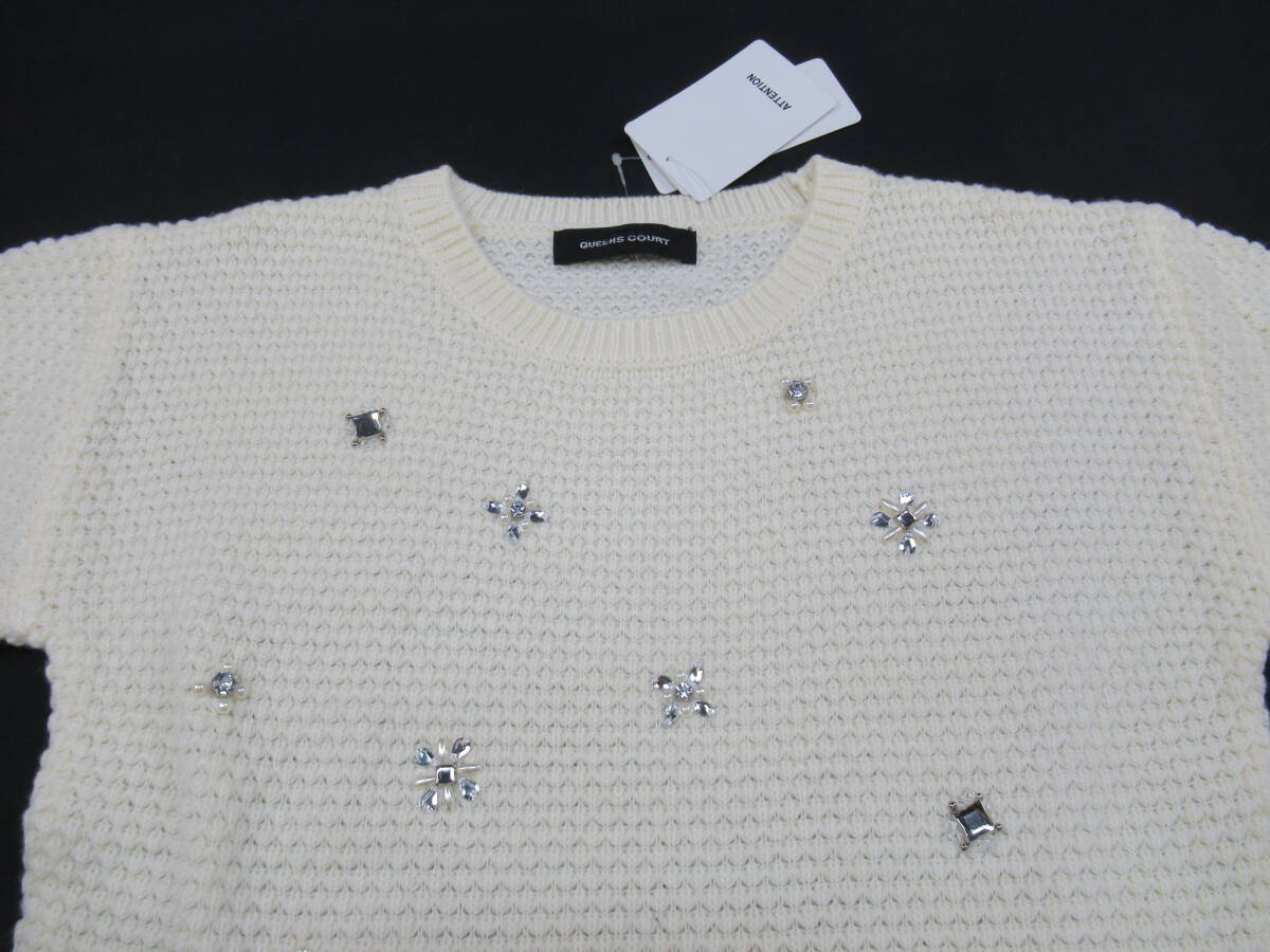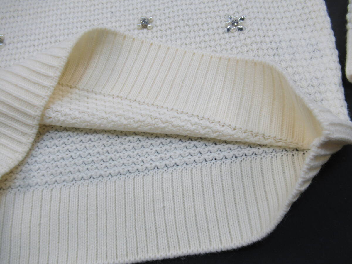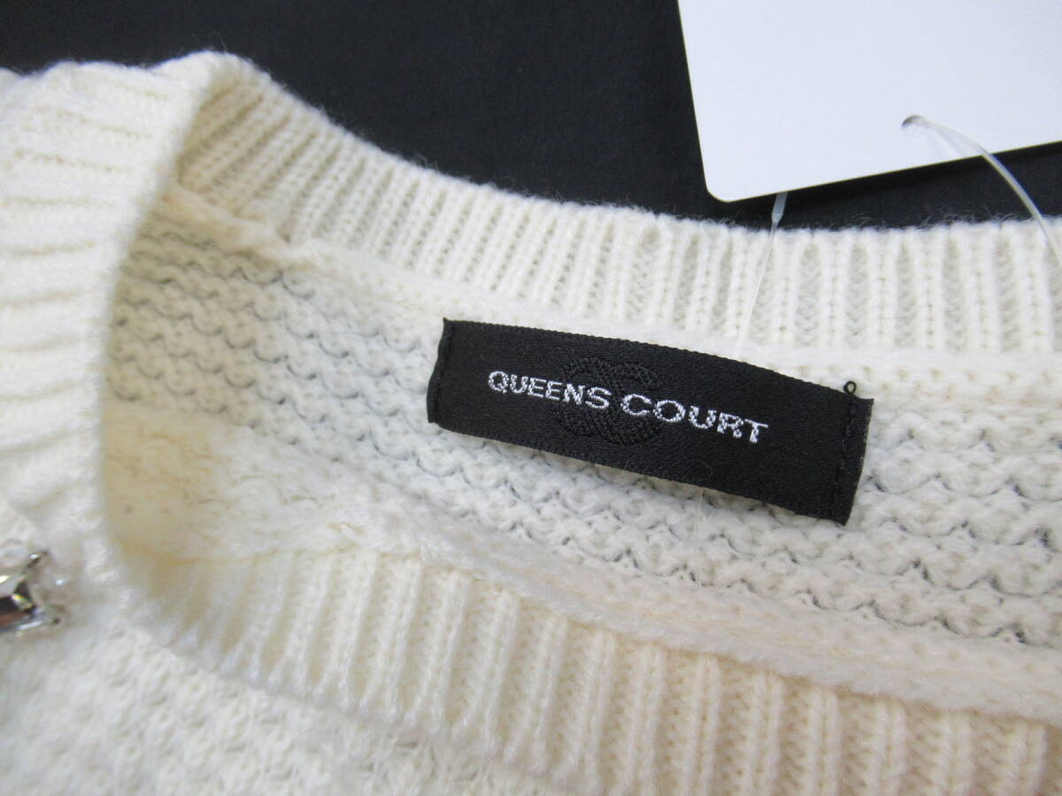 【送900円】1011 未着用品 QUEENS COURT クイーンズコート Uネックセーター ロングスリーブ ビジュー アクリル×毛 ホワイト 2