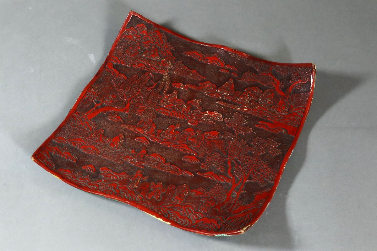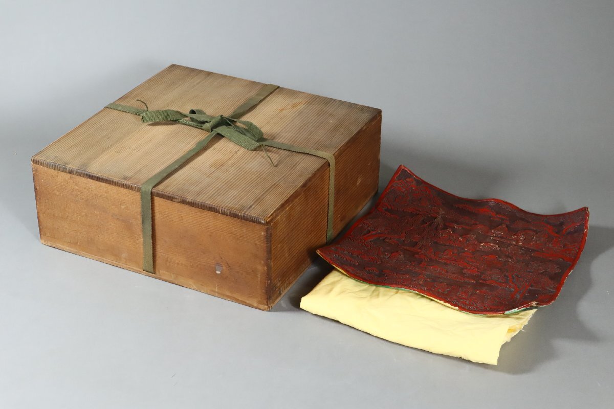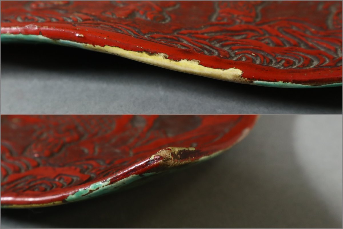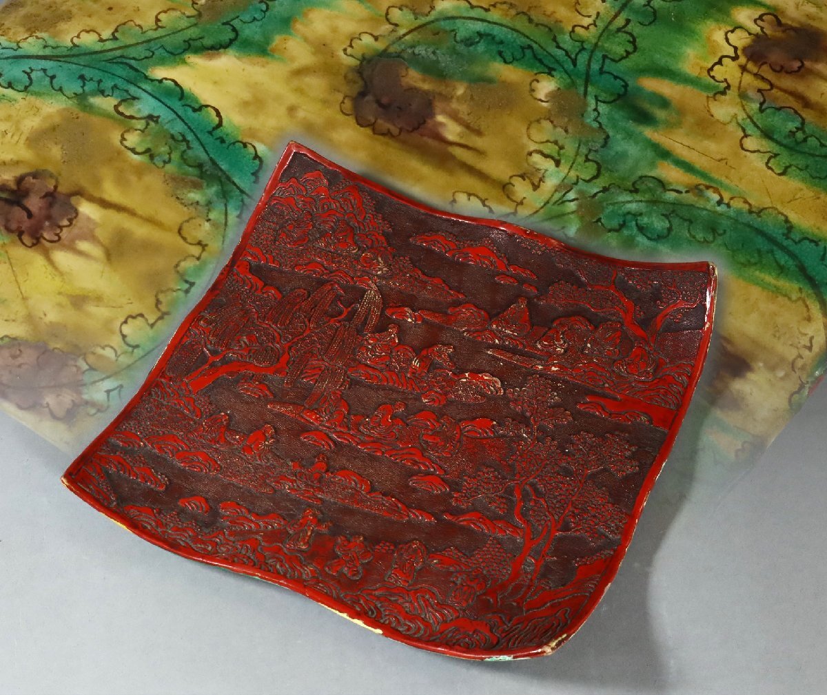 | 中国古玩 堆朱風三彩四方皿 陶器 時代箱 珍品 /中国美術 菓子器 |