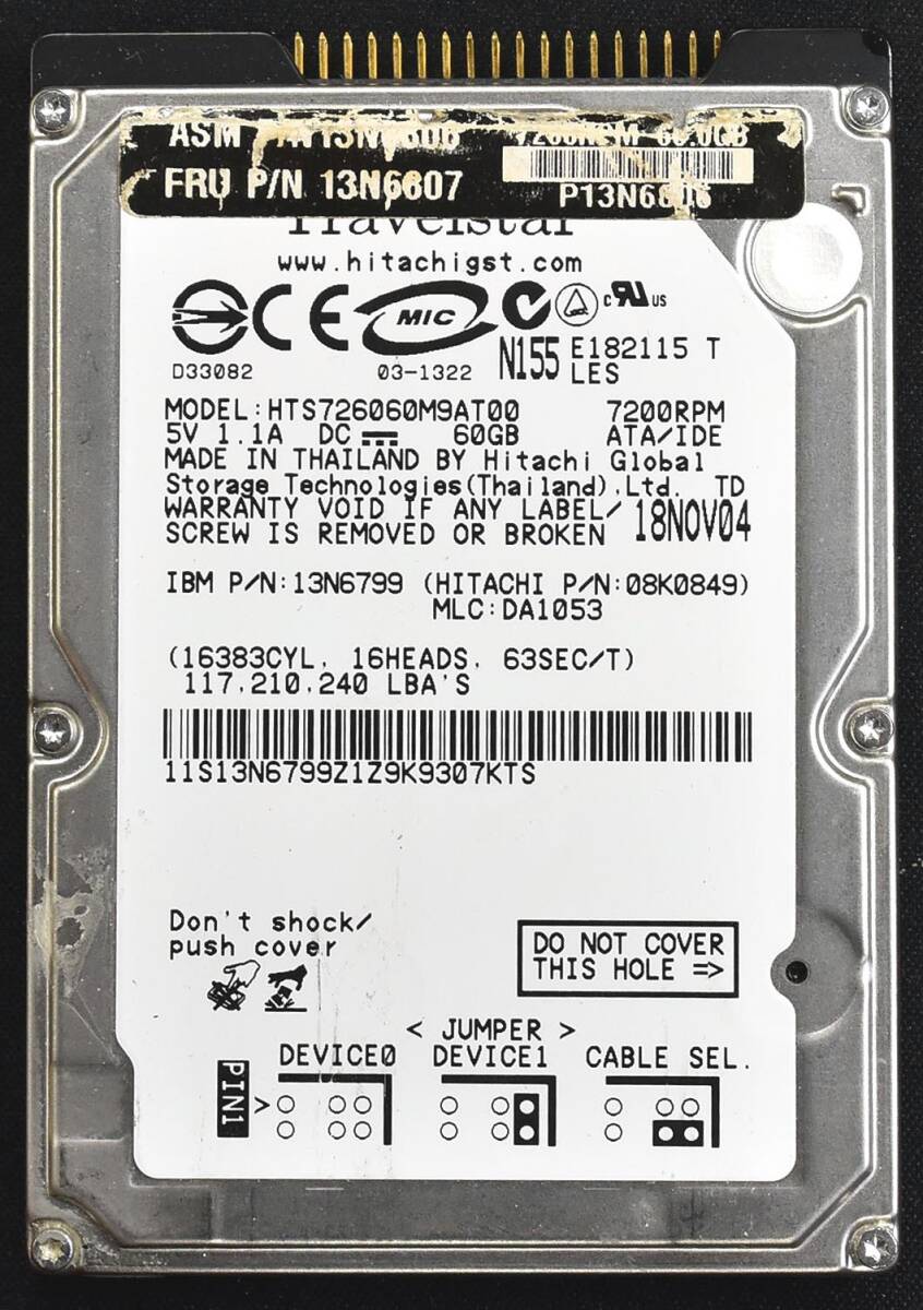 HGST Travelstar 7K60 HTS726060M9AT00 [60G 回転数7,200rpm] 2.5インチ 44pin IDE パラレルATA HDD 9.5mm厚 使用時間 12812H (管:HT50