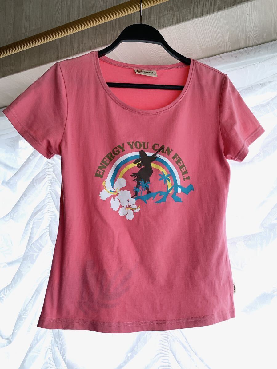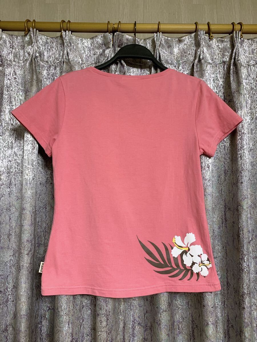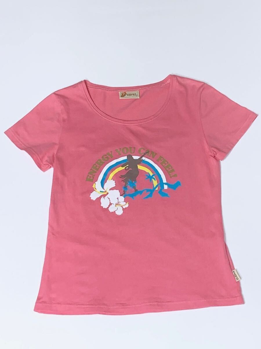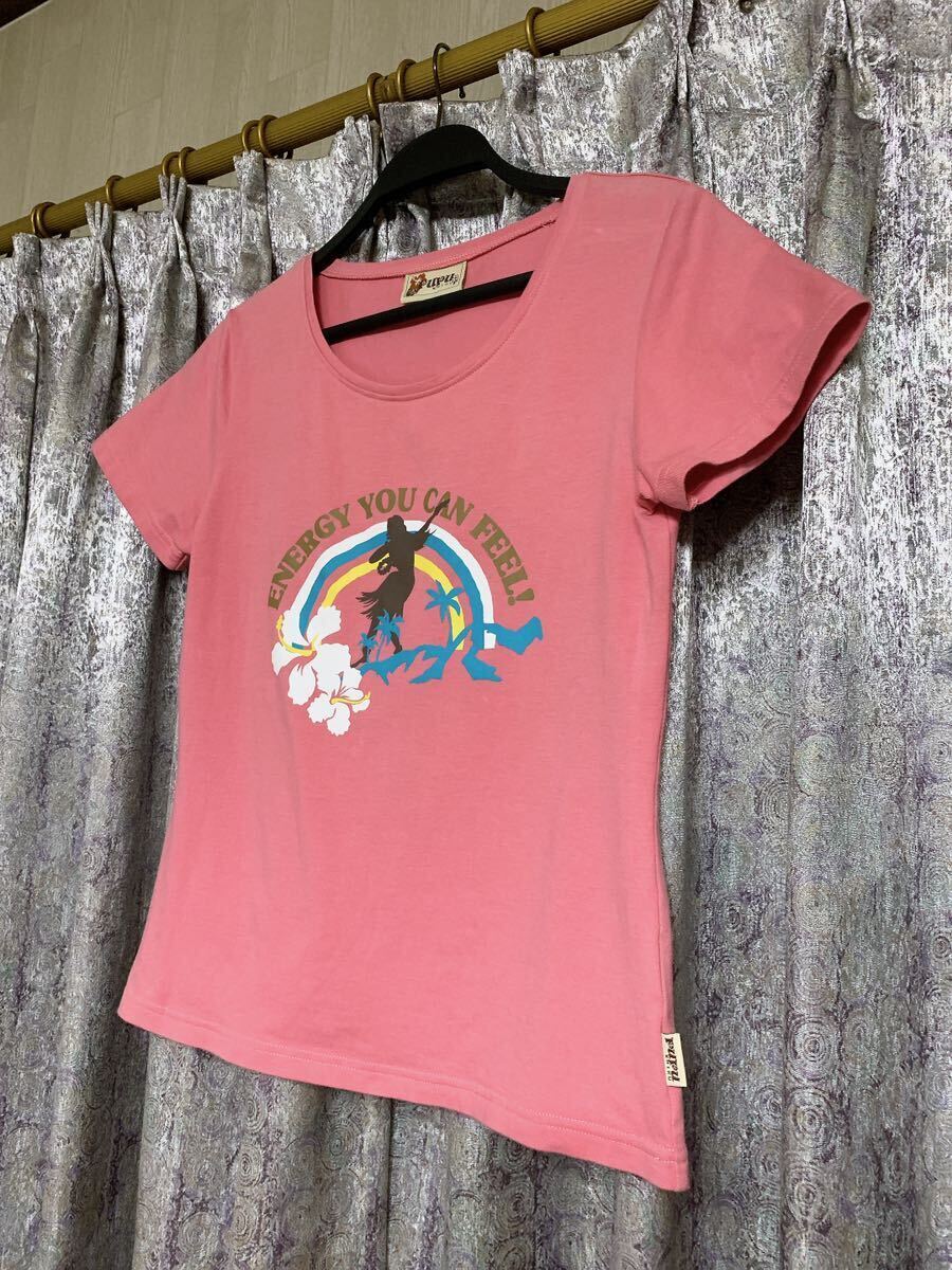 可愛い落ち着きのあるピンクにハイビスカス レインボー ヤシの木などハワイ感満載プリント。