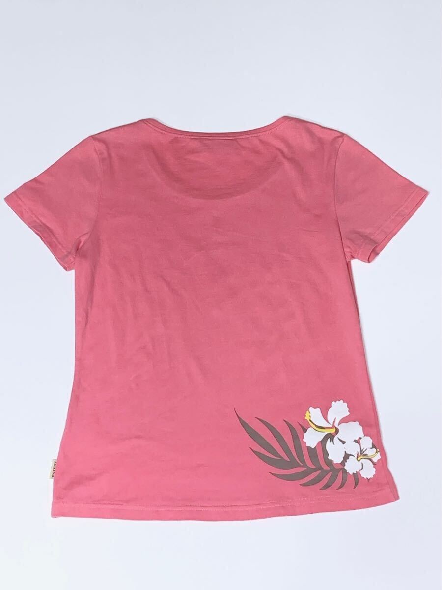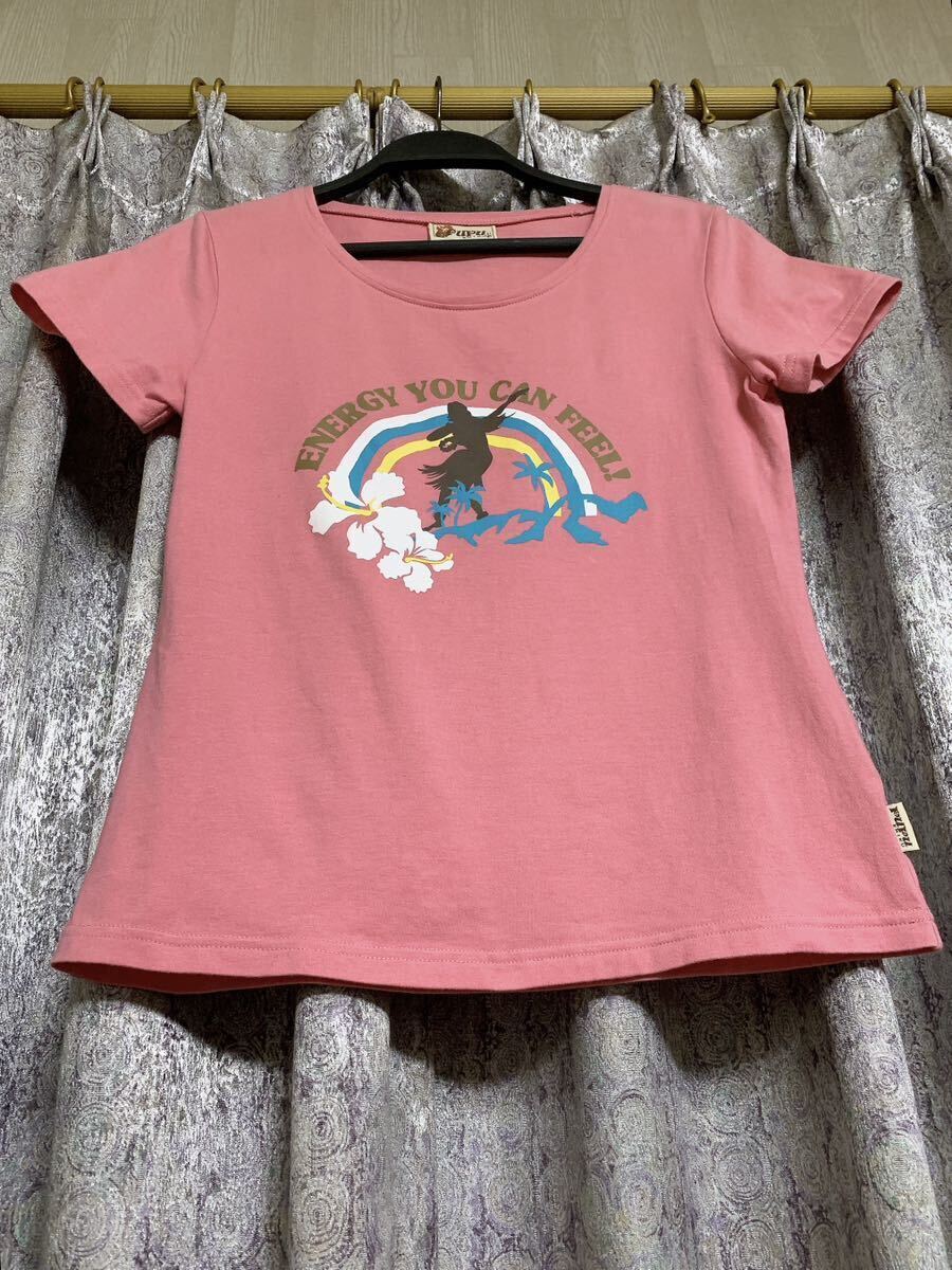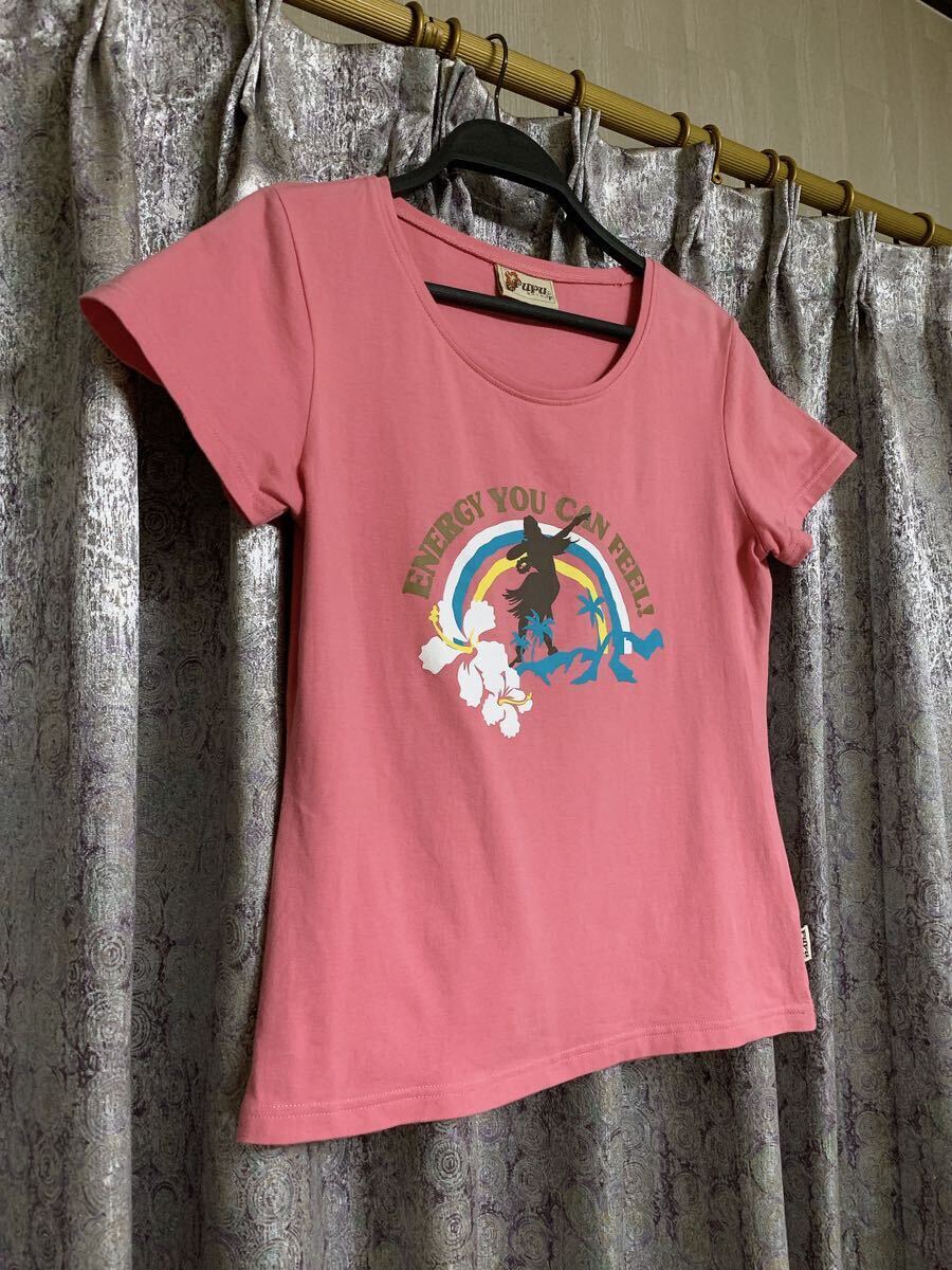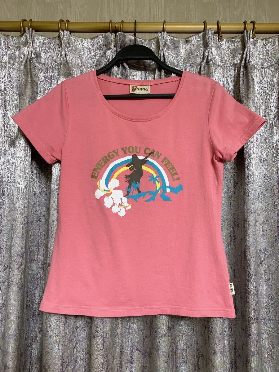 可愛い落ち着きのあるピンクにハイビスカス レインボー ヤシの木などハワイ感満載プリント。
