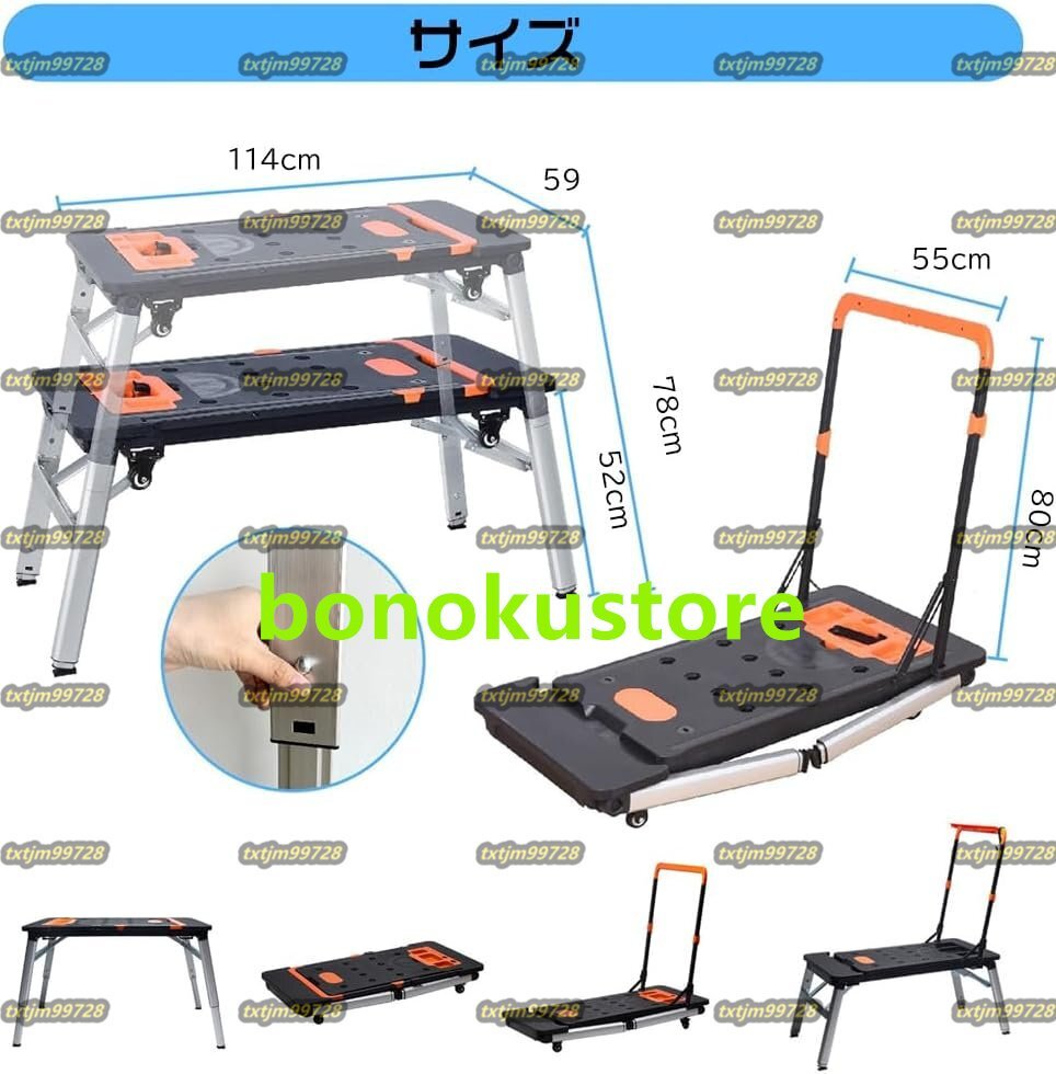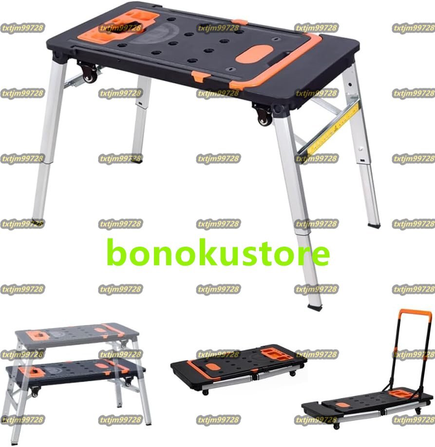 【7-in-1】多機能足場台は、作業台、鋸引き、ワークベンチ、平台車、自動車ローラー、ハンドカートなど、7つの強力な実用的な機能を備えています。 ご自宅のリフォーム、窓拭き、洗車、工事現場での外装工事や壁紙貼りなど、この作業台がしっかりサポートします。