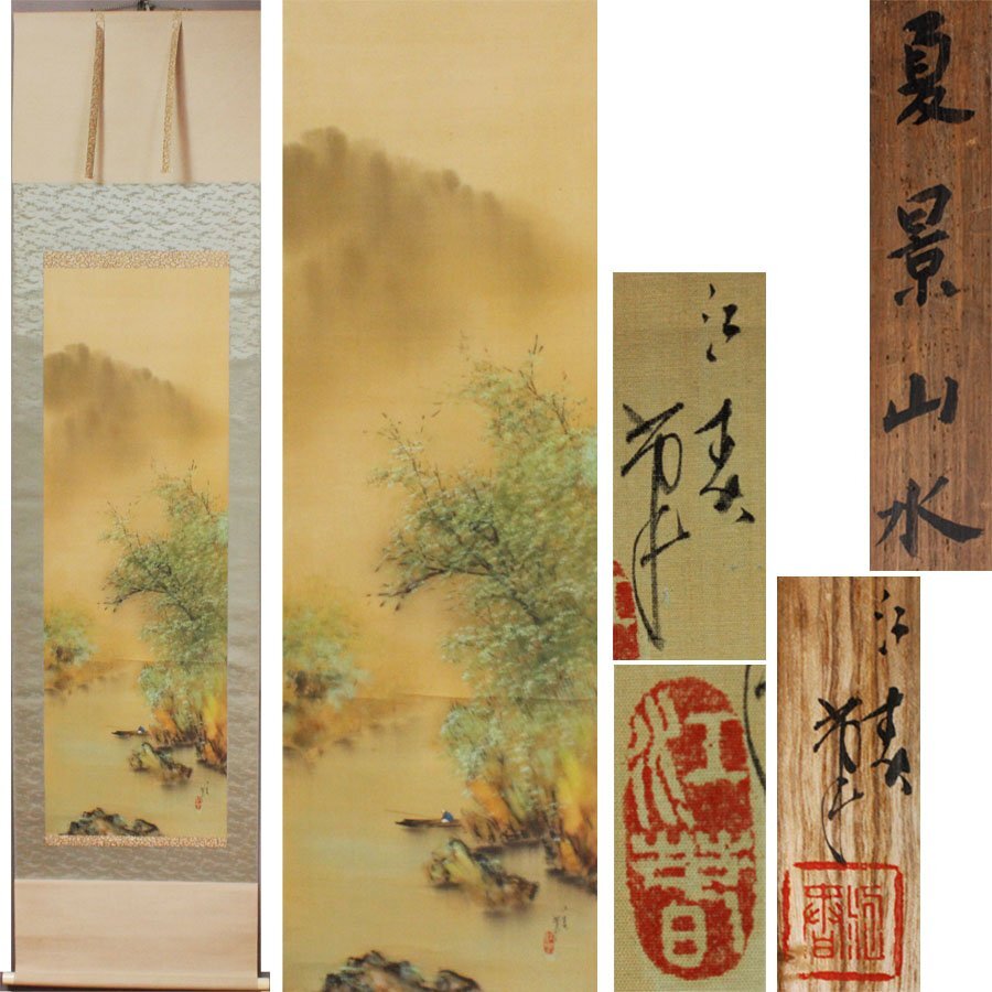 ■商品説明 下記、押柄江春の手によって、 夏景山水図が描かれた品。 新緑の匂いの中、渓谷の水面にて 静かに釣りをしている人物が描かれた、 趣きたっぷりの作品です。 《 押柄江春(おしがら こうしゅん) 》 明治28年生まれ。 大阪市住吉区天王寺町住。 父親は日本画家であった押柄憲嶂。 菊池芳文・北野恒富に師事する。 山水、花鳥・人物を得意とし、 後世は、美人画家として活躍。 ■絹本・肉筆 ■状 態 時代なりのヤケ・オレ等あり。 ■寸 法 軸寸法/約185.0cm×約44.0cm。 本紙寸法/約 99.0cm×約32.5cm。 ■落 款 ご覧の様な銘?・落款?等あり。 ■箱 箱。 【即決・送料無料】の表示商品に限り、 一部地域(北海道・沖縄)を除き、送料無料キャンペーンを実施しております。 ご希望の方は、お早めに入札して頂けます様、宜しくお願い致します。 【※※なお、作品に対して疑問や質問がある場合には、※※】 質問欄もしくは、ストア情報に当方の情報が記載されておりますので、こちらをクリックしてお問い合わせ下さい。 宜しくお願い致します。 |