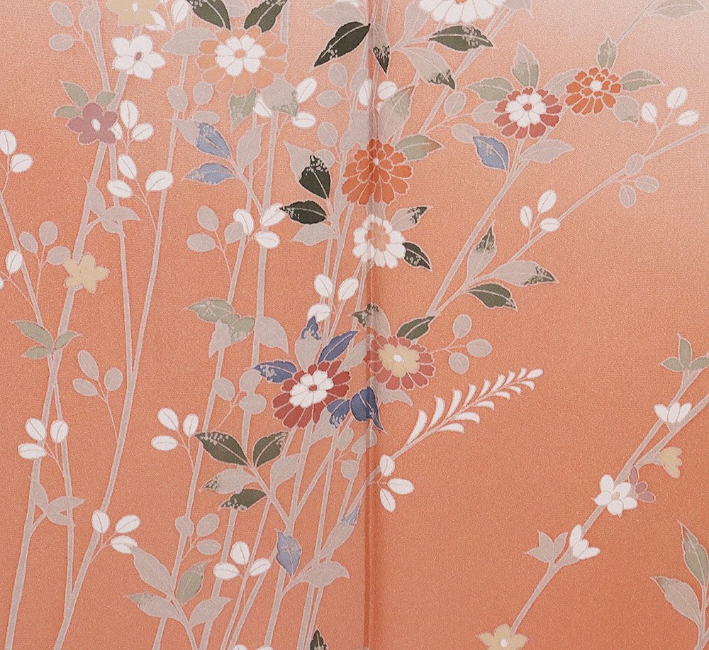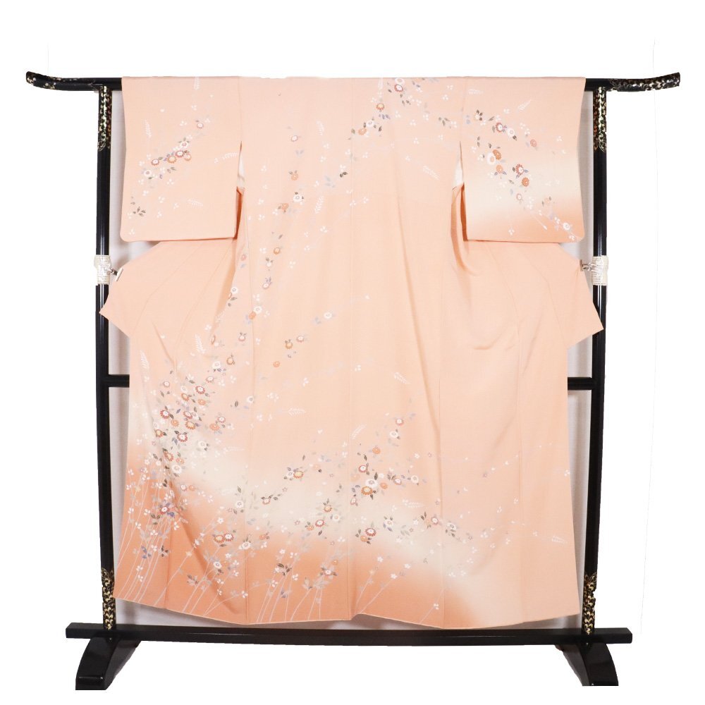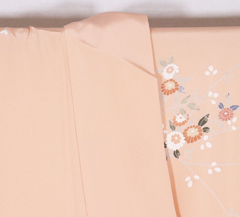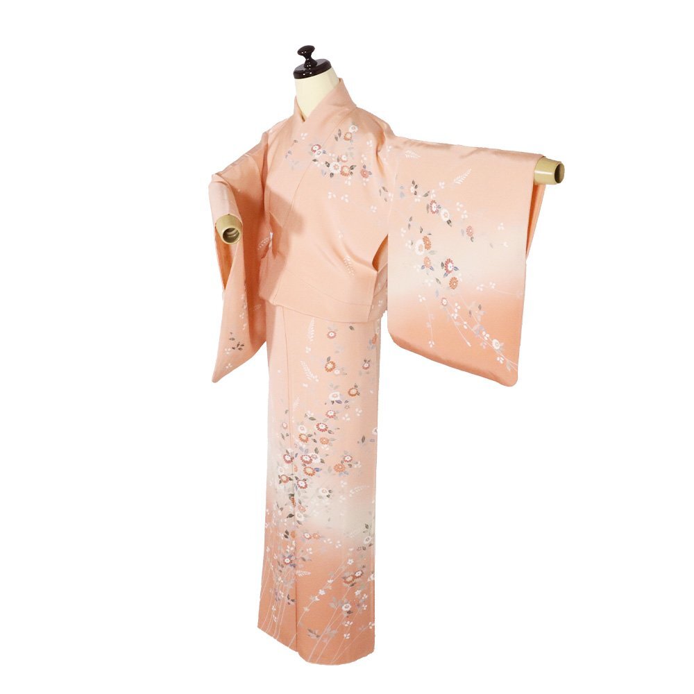 | 友禅訪問着 袷 丹後縮緬地 サーモンピンク暈し地 菊・南天 160 広襟 |