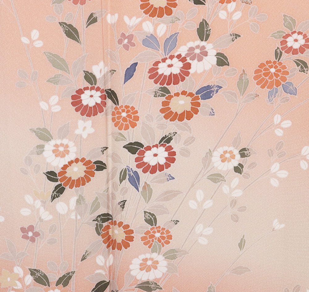 友禅訪問着 袷 丹後縮緬地 サーモンピンク暈し地 菊・南天 (写真では上手く色が出ない場合があります。ご了承下さい) |