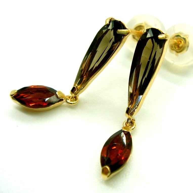 PC1681:K18YG スモーキークォーツ(煙水晶) ガーネット ピアス