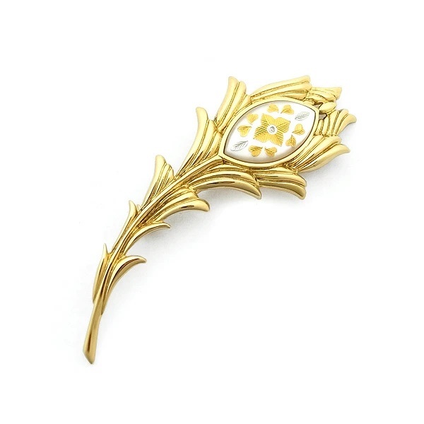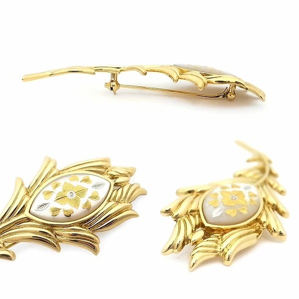 コメント しなやかで美しい羽根の様なモチーフと白蝶貝(ホワイトシェル)に独特な技法で金銀模様をはめ込んだ「ピクウェ」を組み合わせた華やかなブローチ。躍動感と神秘的な煌めき、ミキモト(MIKIMOTO)ならではの精妙な細工が際立つジュエリーです。