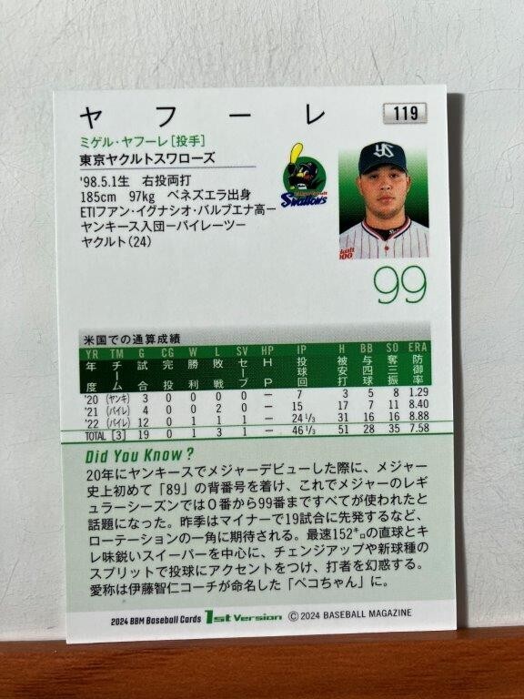 【2024 BBM 1st】119ヤフーレ(東京ヤクルトスワローズ)レギュラーカード