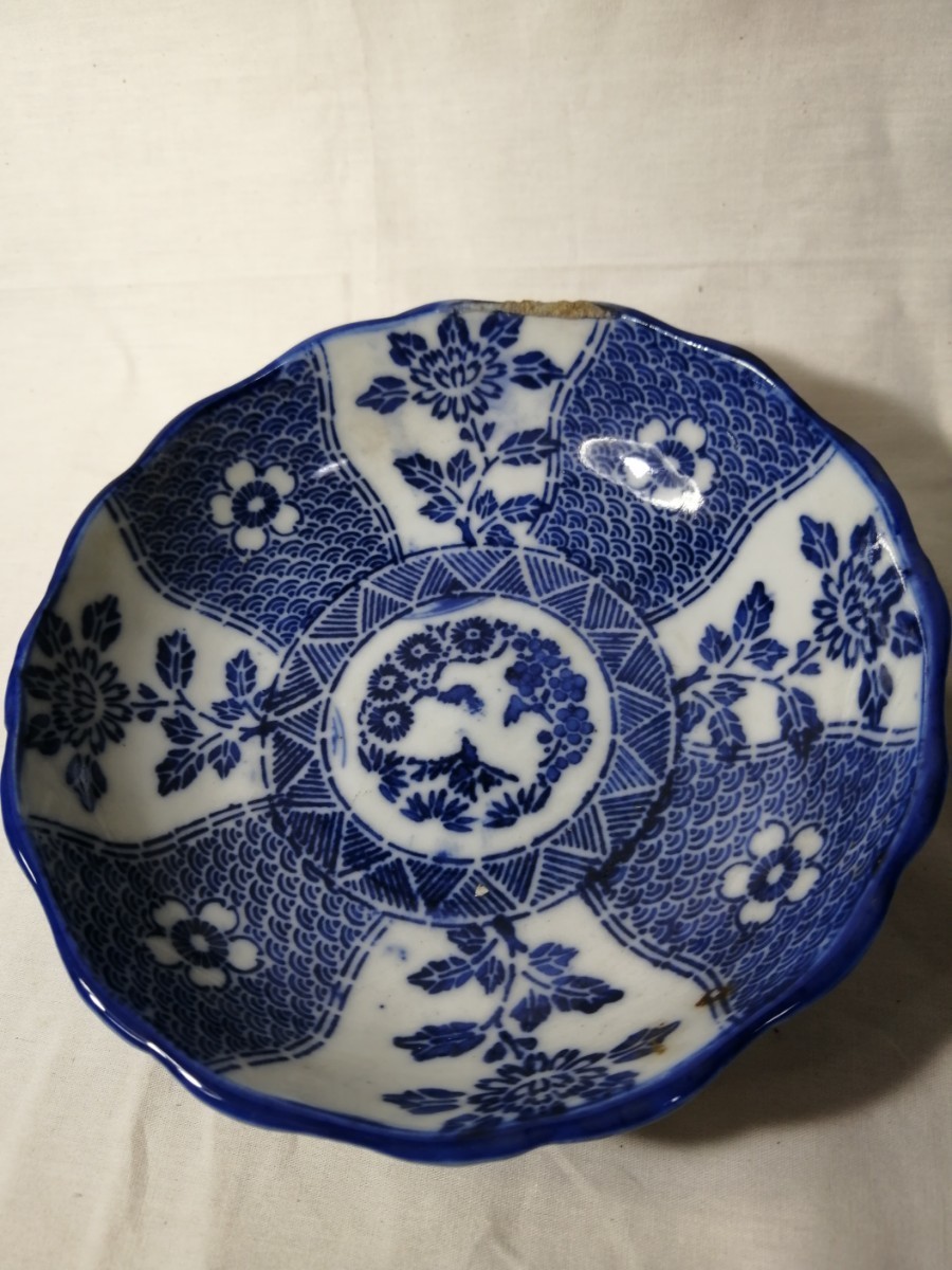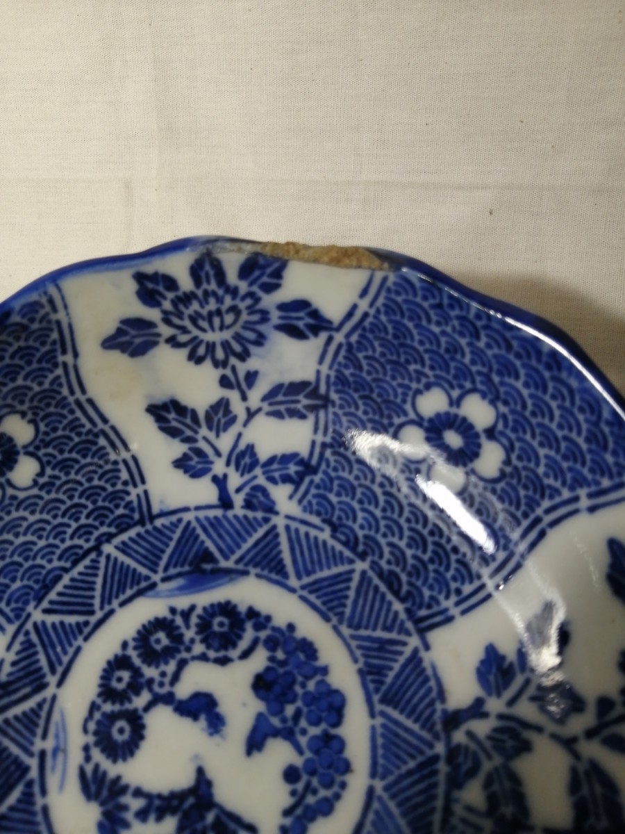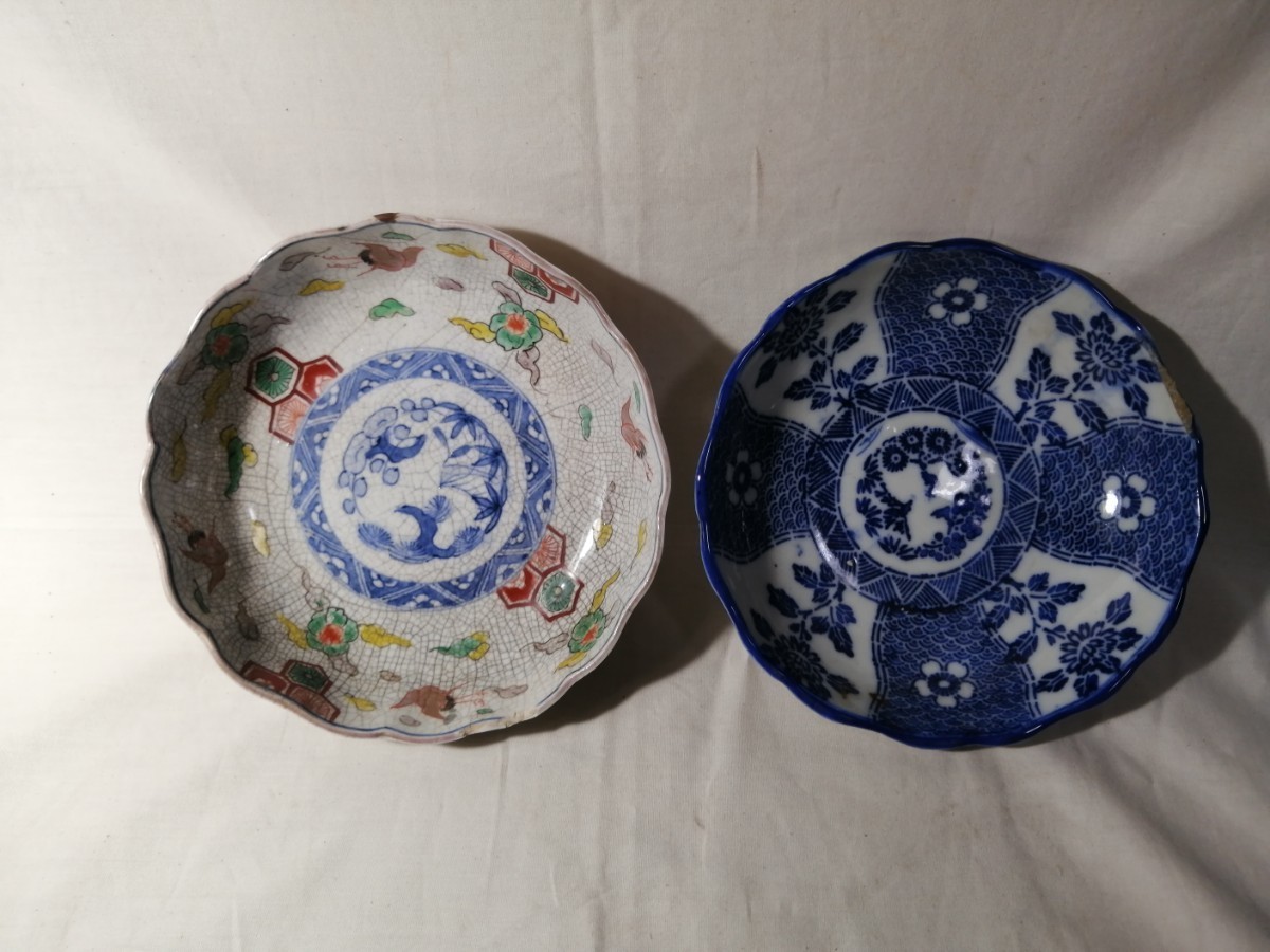伊万里赤絵と瀬戸染付けのナマス皿です。伊万里は江戸後期の製品で、見込みの染付けの周りに赤絵が施された上品な器です。ホツレとニュー直しがあります。瀬戸の転写は明治の製品で、発色の良い品です。窯キズがあります。