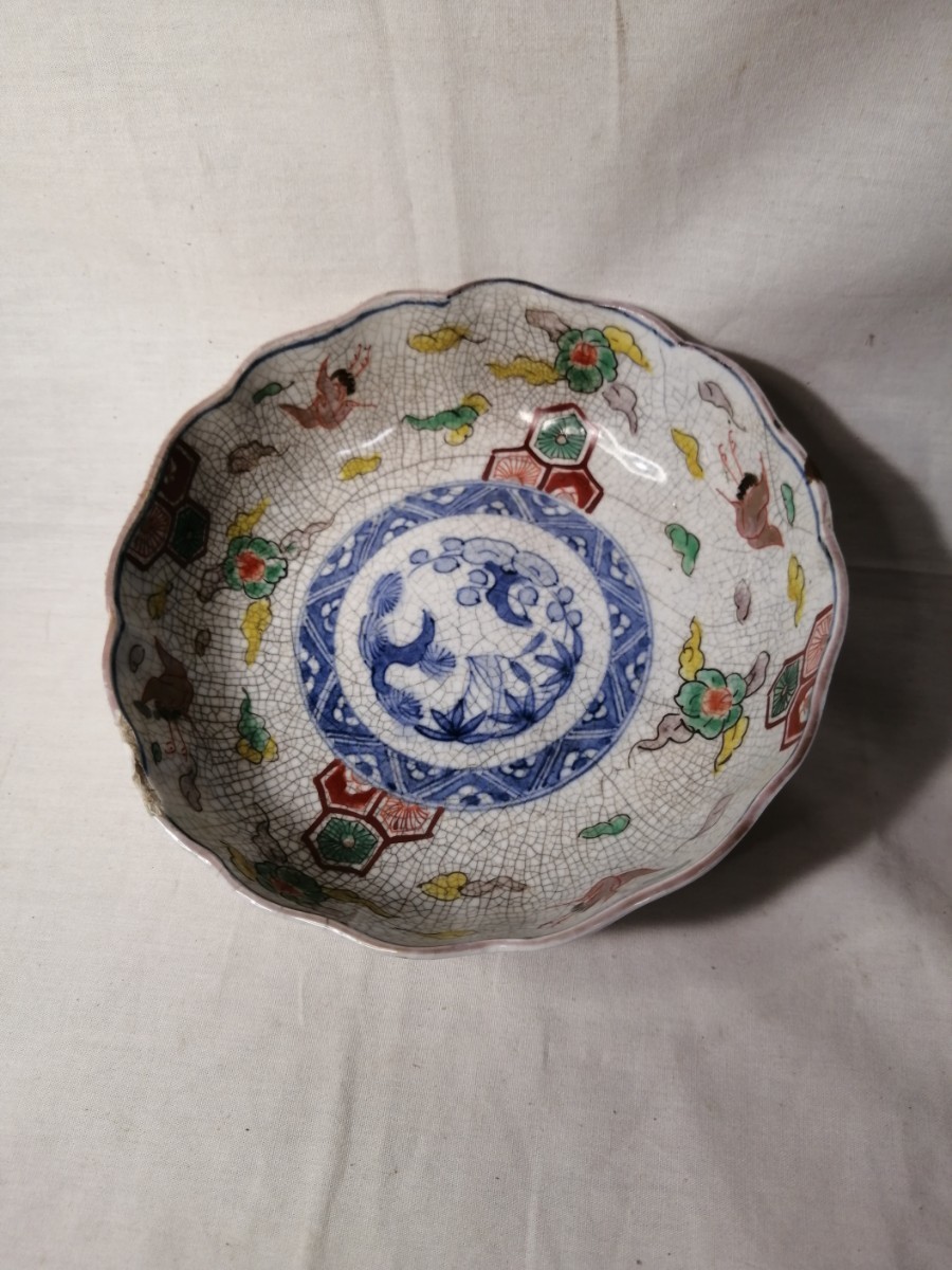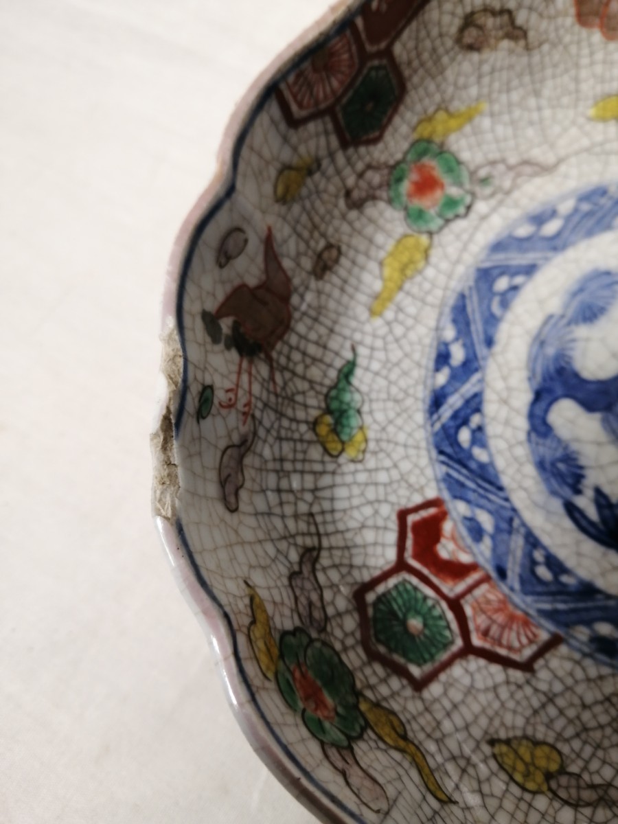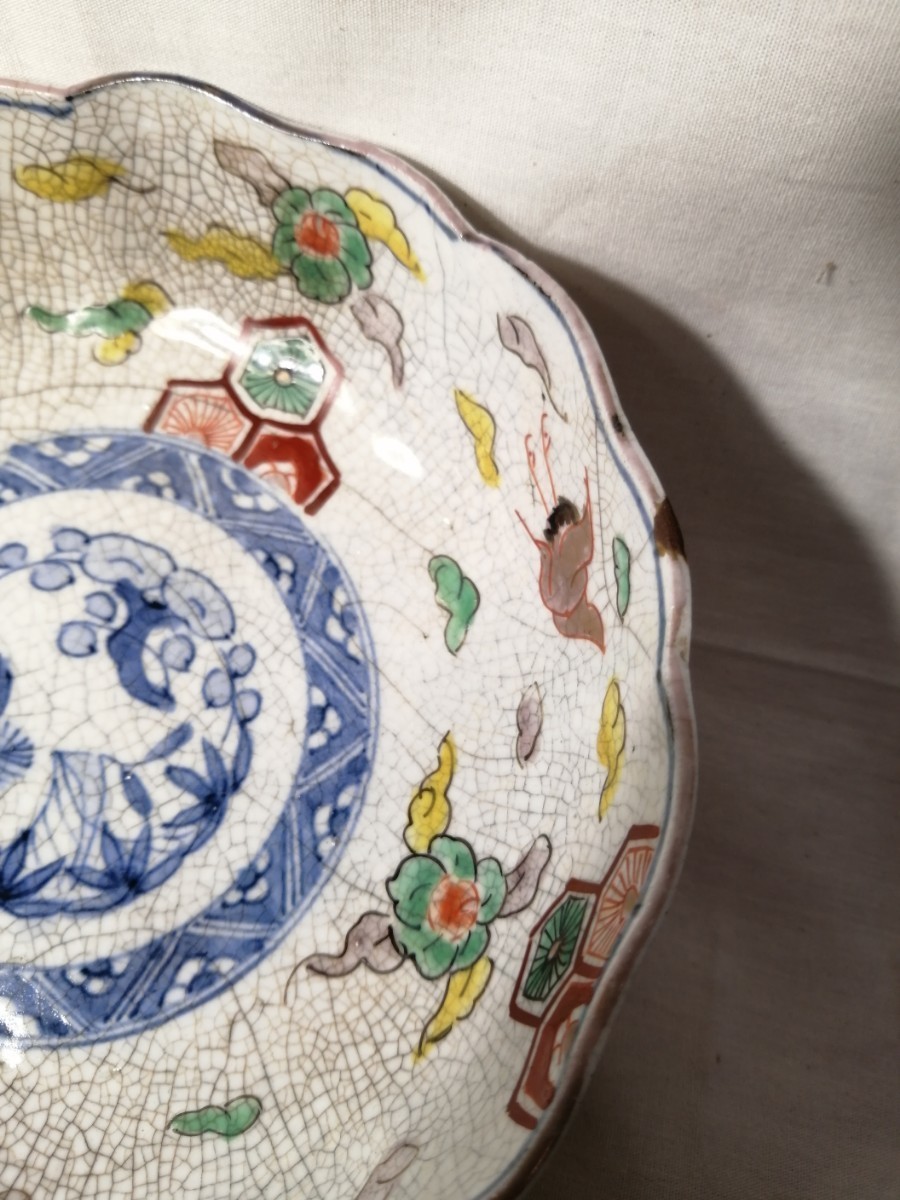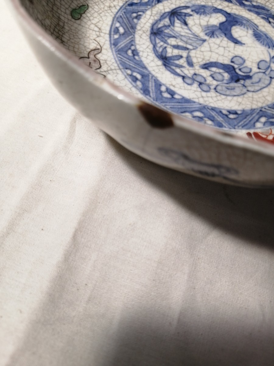 伊万里赤絵と瀬戸染付けのナマス皿です。伊万里は江戸後期の製品で、見込みの染付けの周りに赤絵が施された上品な器です。ホツレとニュー直しがあります。瀬戸の転写は明治の製品で、発色の良い品です。窯キズがあります。