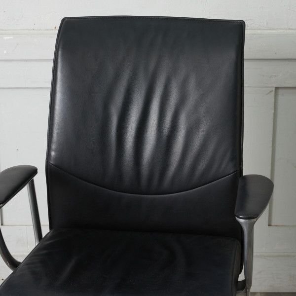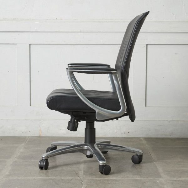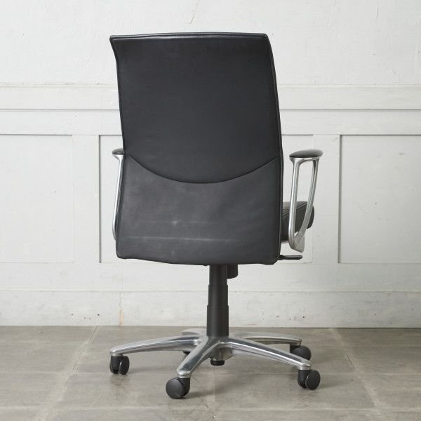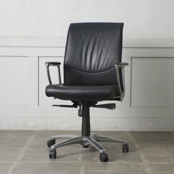 現在は生産されていない、デザイン性、実用性を兼ねたバランスの良い一品。背に添うように湾曲して伸びたフォルムはしっくりと身体に馴染み、快適な座り心地を提供します。オフィスチェアとしてはもちろん、書斎・勉強部屋のデスクチェアとしておすすめの1脚です。