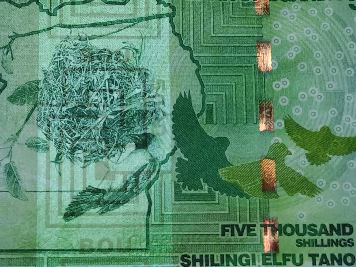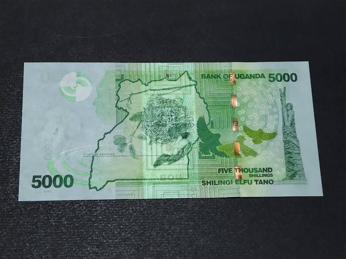 ウガンダ 5000 Shillings札  コレクション向きのピン札  未使用~甘い未使用  2010年  初期発行版 鳥 ハタオリドリ 巣 WWII記念碑 p-51a #AC7510335