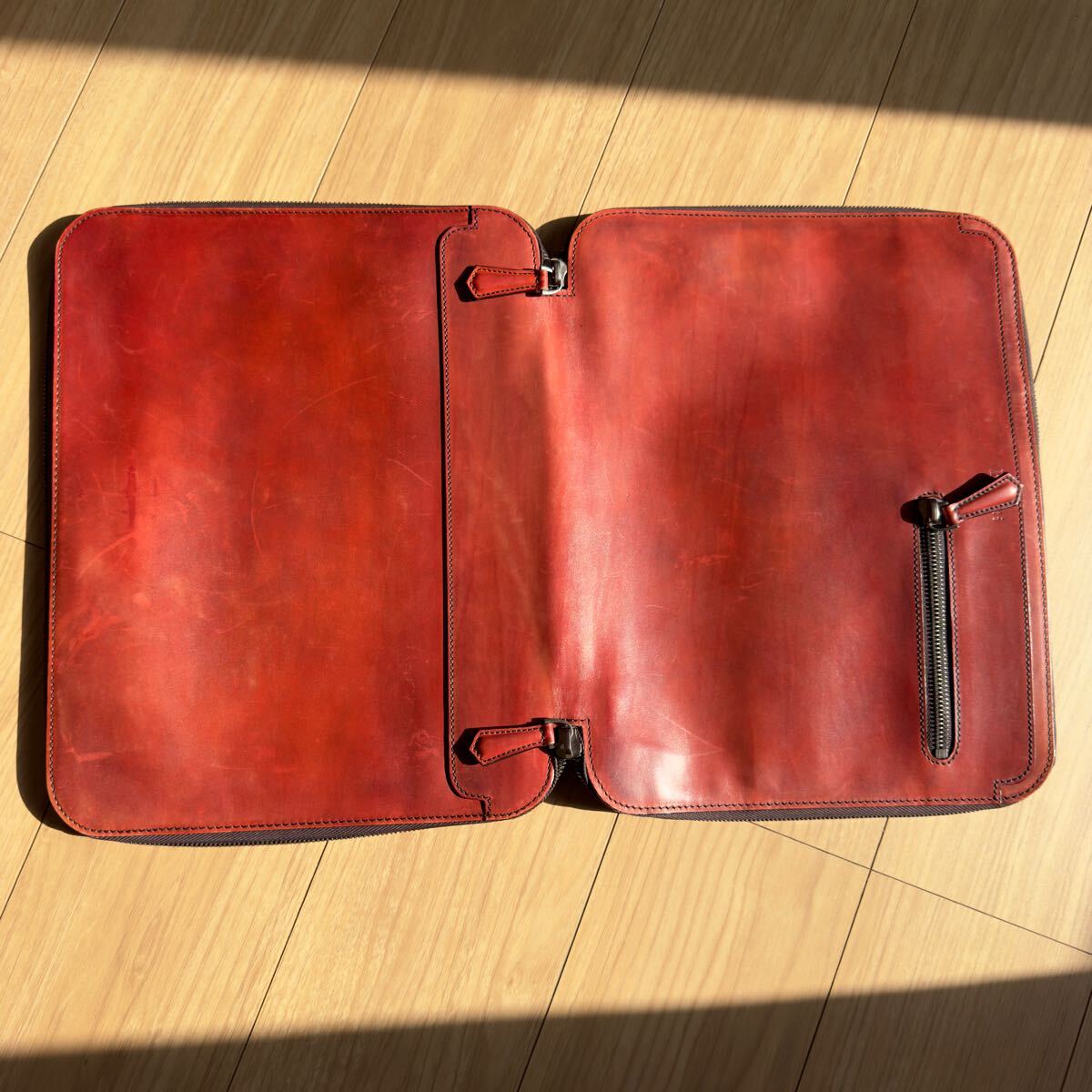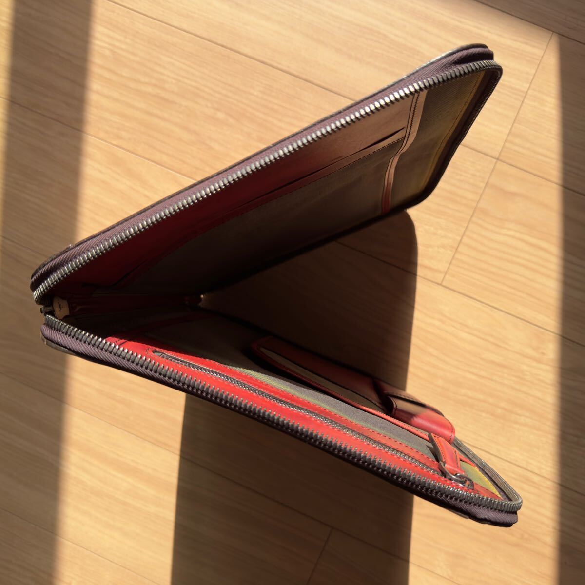 その他フラップ付ペンポケットや小銭入れや名刺入れ、長財布を入れるポケットなど完成度の高い機能美を持つ仕様となっており、同色パティーヌをしたベネチアレザーを贅沢にあちこちに配しております。